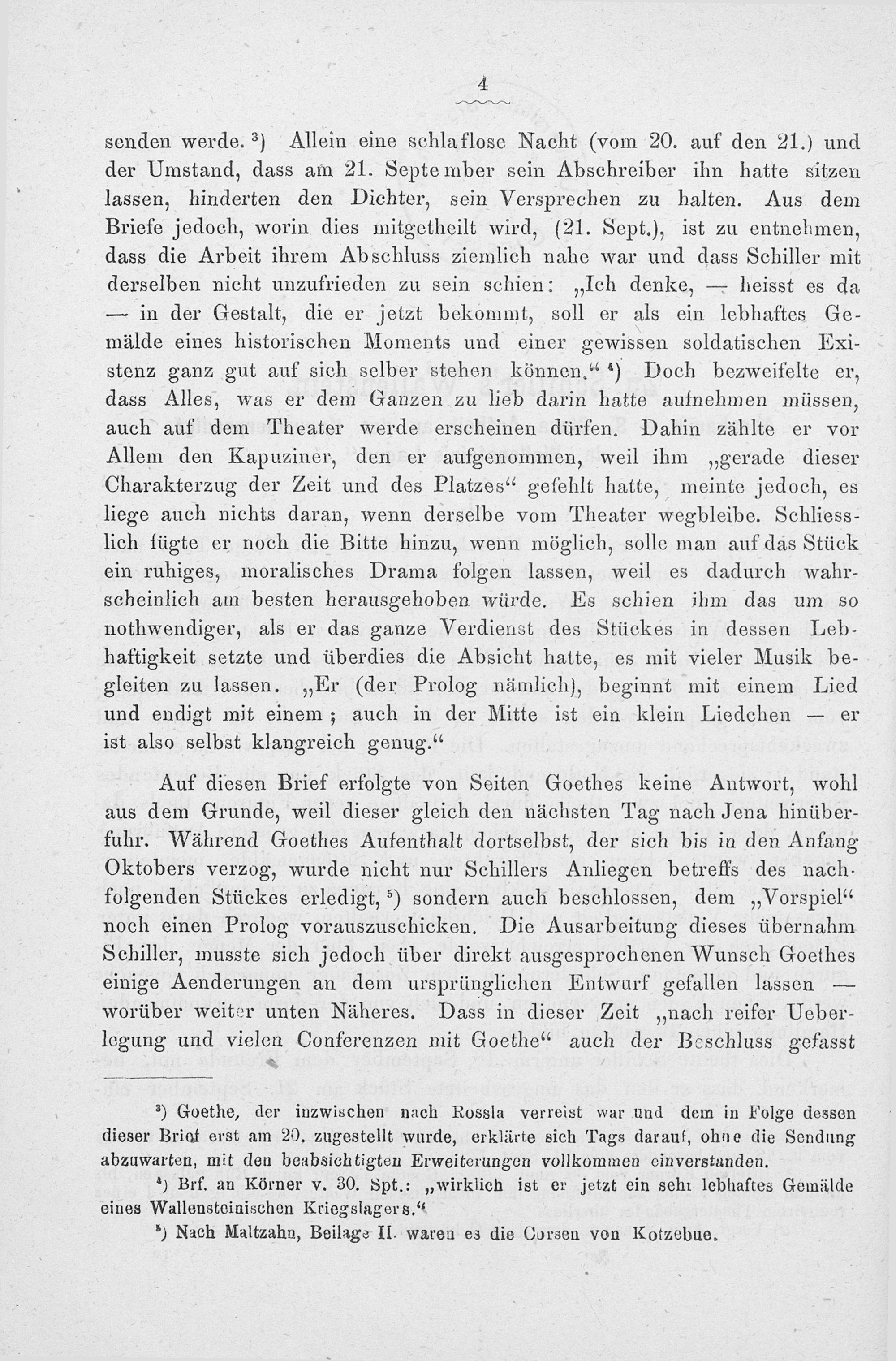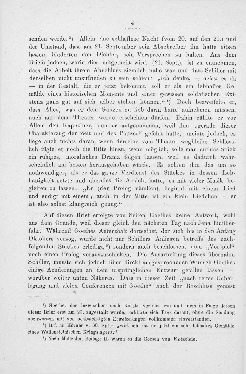 senden werde. ³) Allein eine schlaflose Nacht(vom 20. auf den 21.) und der Umstand, dass am 21. September sein Abschreiber ihn hatte sitzen lassen, hinderten den Dichter, sein Versprechen zu halten. Aus dem Briefe jedoch, worin dies mitgetheilt wird,(21. Sept.), ist zu entnehmen, dass die Arbeit ihrem Abschluss ziemlich nahe war und dass Schiller mit derselben nicht unzufrieden zu sein schien:„Ich denke,— heisst es da — in der Gestalt, die er jetzat bekommt, soll er als ein lebhaftes Ge- mälde eines historischen Moments und einer gewissen soldatischen Exi- stenz ganz gut auf sich selber stehen können.“⁴) Doch bezweifelte er, dass Alles, was er dem Ganzen zu lieb darin hatte aufnehmen müssen, auch auf dem Theater werde erscheinen dürfen. Dahin zählte er vor Allem den Kapuziner, den er aufgenommen, weil ihm„gerade dieser Charakterzug der Zeit und des Platzes“ gefehlt hatte, meinte jedoch, es liege auch nichts daran, wenn derselbe vom Theater wegbleibe. Schliess- lich fügte er noch die Bitte hinzu, wenn möglich, solle man auf das Stück ein ruhiges, moralisches Drama folgen lassen, weil es dadurch wahr- scheinlich am besten herausgehoben würde. Es schien ihm das um so nothwendiger, als er das ganze Verdienst des Stückes in dessen Leb- haftigkeit setzte und überdies die Absicht hatte, es mit vieler Musik be- gleiten zu lassen.„Er(der Prolog nämlich), beginnt mit einem Lied und endigt mit einem; auch in der Mitte ist ein klein Liedchen— er ist also selbst klangreich genug.“