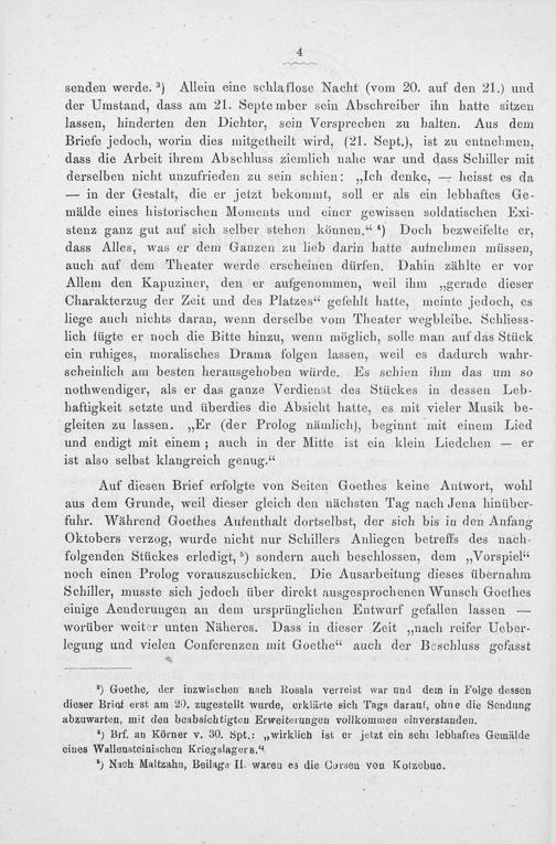 Auf diesen Brief erfolgte von Seiten Goethes keine Antwort, wohl aus dem Grunde, weil dieser gleich den nächsten Tag nach Jena hinüber- fuhr. Während Goethes Aufenthalt dortselbst, der sich bis in den Anfang Oktobers verzog, wurde nicht nur Schillers Anliegen betreffs des nach- folgenden Stückes erledigt, 5) sondern auch beschlossen, dem„Vorspiel“ noch einen Prolog vorauszuschicken. Die Ausarbeitung dieses übernahm Schiller, musste sich jedoch über direkt ausgesprochenen Wunsch Gocthes einige Aenderungen an dem ursprünglichen Entwurf gefallen lassen— worüber weiter unten Näheres. Dass in dieser Zeit„nach reifer Ueber- legung und vielen Conferenzen mit Goethe“ auch der Beschluss gefasst