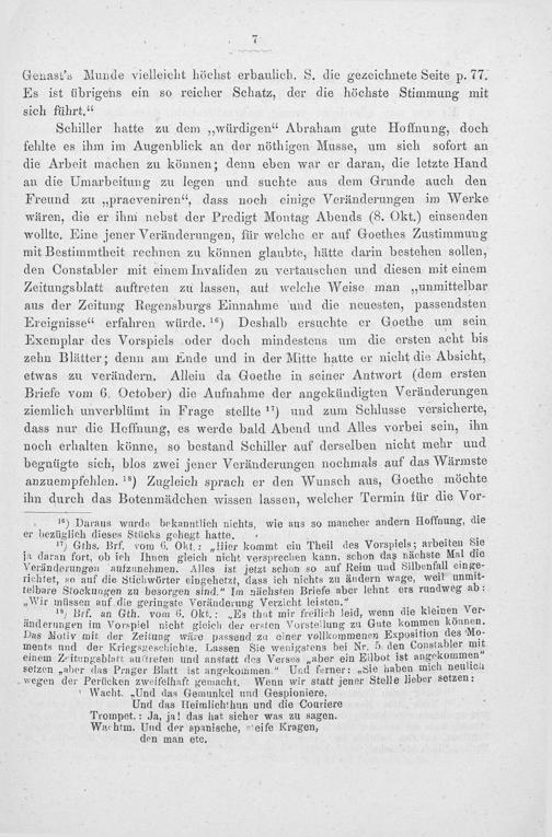 Schiller hatte zu dem„würdigen“ Abraham gute Hoffnung, doch fehlte es ihm im Augenblick an der nöthigen Musse, um sich sofort an die Arbeit machen zu können; denn eben war er daran, die letzte Hand an die Umarbeitung zu legen und suchte aus dem Grunde auch den Freund zu„praeveniren“, dass noch einige Veränderungen im Werke wären, die er ihm nebst der Predigt Montag Abends(8. Okt.) einsenden wollte. Eine jener Veränderungen, für welche er auf Goethes Zustimmung mit Bestimmtheit rechnen zu können glaubte, hätte darin bestehen sollen, den Constabler mit einem Invaliden zu vertauschen und diesen mit einem Zeitungsblatt auftreten zu lassen, auf welche Weise man„unmittelbar aus der Zeitung Regensburgs Einnahme und die neuesten, passendsten Ereignisse“ erfahren würde. ¹⁵) Deshalb ersuchte er Goethe um sein Exemplar des Vorspiels oder doch mindestens um die ersten acht bis zehn Blätter; denn am Ende und in der Mitte hatte er nicht die Absicht, etwas zu verändern. Allein da Goethe in seiner Antwort(dem ersten Briefe vom 6. October) die Aufnahme der angekündigten Veränderungen ziemlich unverblümt in Frage stellte ¹*) und zum Schlusse versicherte, dass nur die Hoffnung, es werde bald Abend und Alles vorbei sein, ihn noch erhalten könne, so bestand Schiller auf derselben nicht mehr und begnügte sich, blos zwei jener Veränderungen nochmals auf das Wärmste anzuempfehlen. ¹³) Zugleich sprach er den Wunsch aus, Goethe möchte ihn durch das Botenmädchen wissen lassen, welcher Termin für die Vor-