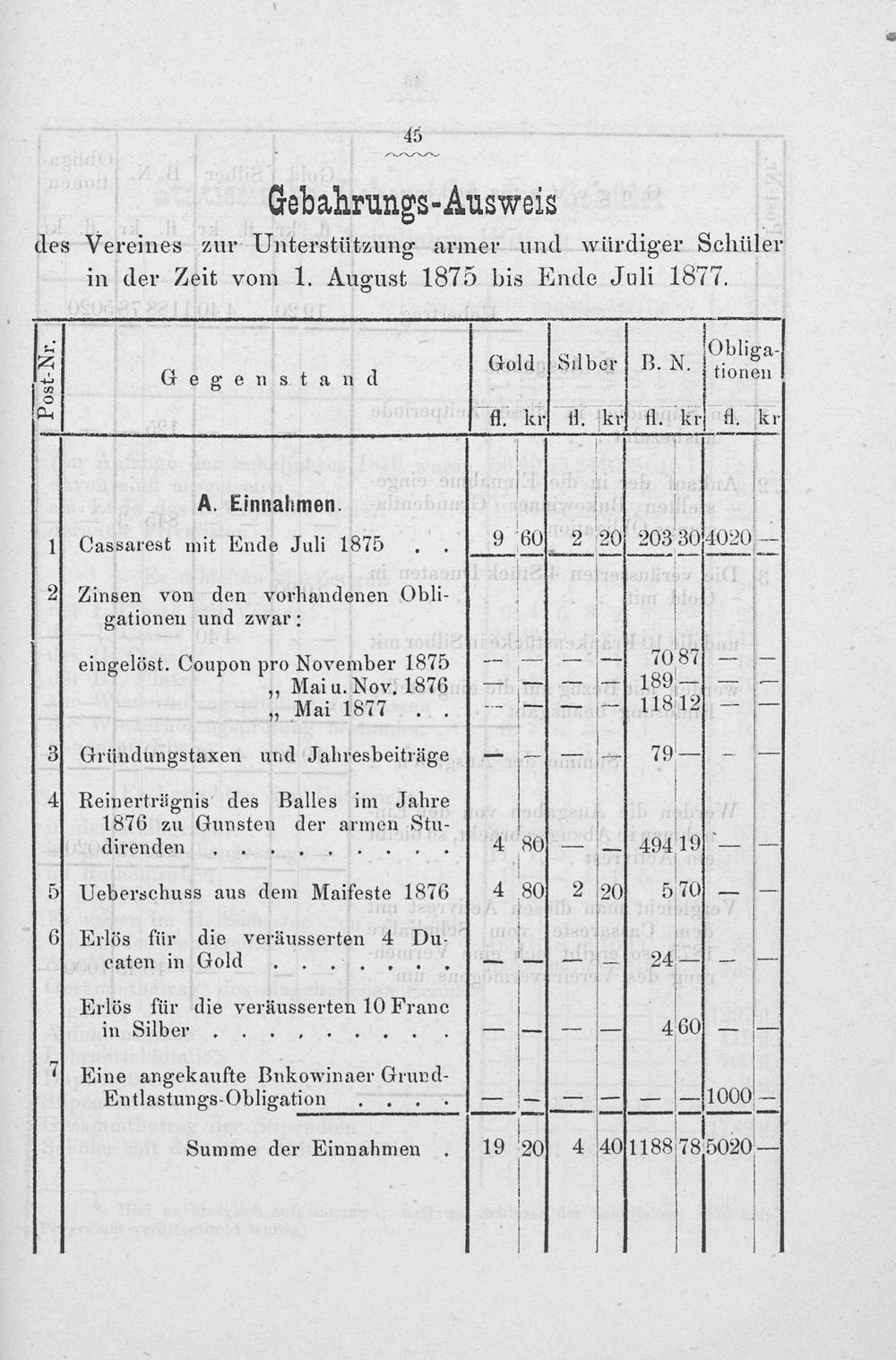 des Vereines zur Unterstützung armer und würdiger Schüler in der Zeit vom 1. August 1875 bis Ende Juli 1877.