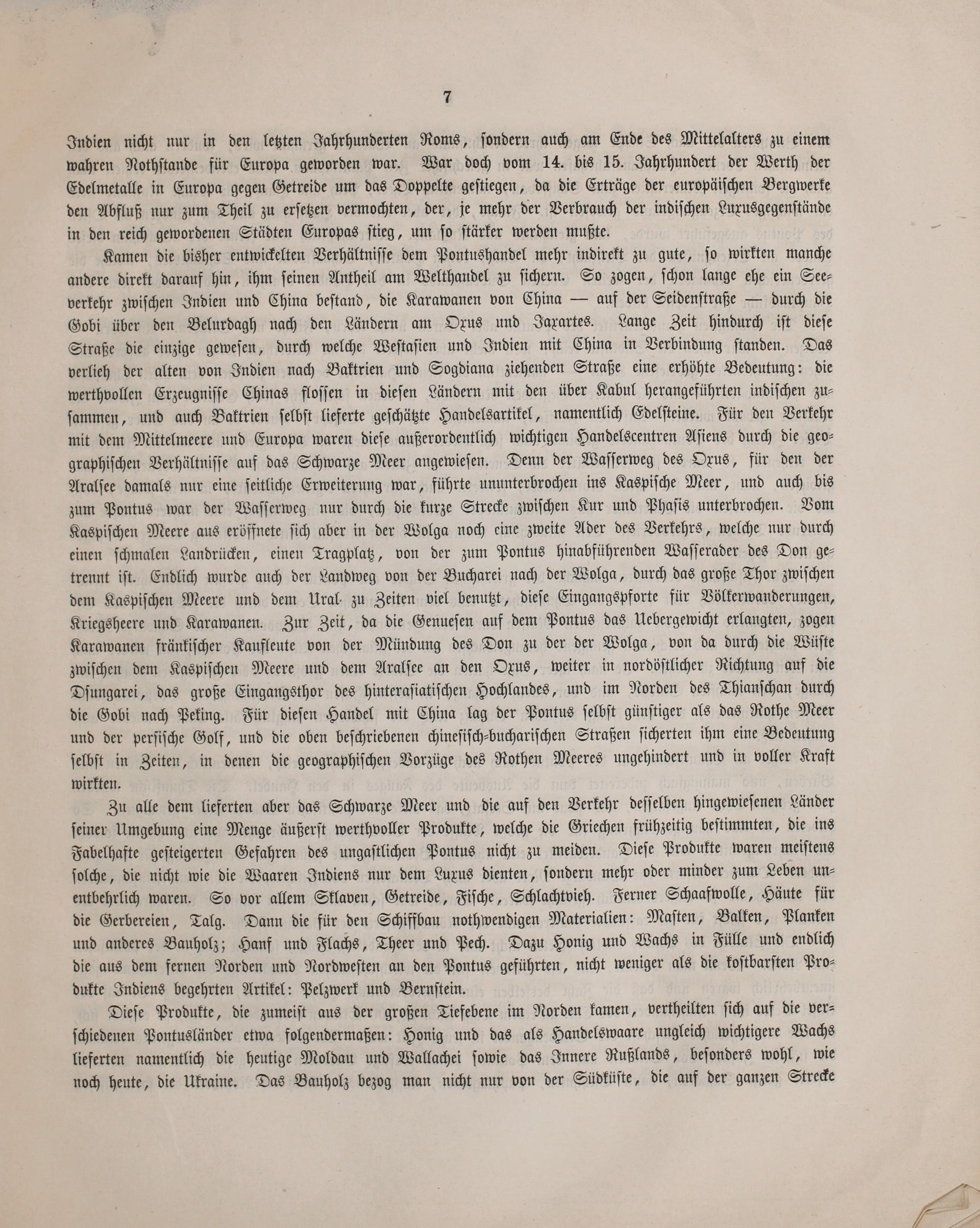 Kamen die bisher entwickelten Verhältniſſe dem Pontushandel mehr indirekt zu gute, ſo wirkten manche andere direkt darauf hin, ihm ſeinen Antheil am Welthandel zu ſichern. So zogen, ſchon lange ehe ein See⸗ verkehr zwiſchen Indien und China beſtand, die Karawanen von China— auf der Seidenſtraße— durch die Gobi über den Belurdagh nach den Ländern am Oxus und Jaxartes. Lange Zeit hindurch iſt dieſe Straße die einzige geweſen, durch welche Weſtaſien und Indien mit China in Verbindung ſtanden. Das verlieh der alten von Indien nach Baktrien und Sogdiana ziehenden Straße eine erhöhte Bedeutung: die werthvollen Erzeugniſſe Chinas floſſen in dieſen Ländern mit den über Kabul herangeführten indiſchen zu⸗ ſammen, und auch Baktrien ſelbſt lieferte geſchätzte Handelsartikel, namentlich Edelſteine. Für den Verkehr mit dem Mittelmeere und Europa waren dieſe außerordentlich wichtigen Handelscentren Aſiens durch die geo⸗ graphiſchen Verhältniſſe auf das Schwarze Meer angewieſen. Denn der Waſſerweg des Oxus, für den der Aralſee damals nur eine ſeitliche Erweiterung war, führte ununterbrochen ins Kaspiſche Meer, und auch bis zum Pontus war der Waſſerweg nur durch die kurze Strecke zwiſchen Kur und Phaſis unterbrochen. Vom Kaspiſchen Meere aus eröffnete ſich aber in der Wolga noch eine zweite Ader des Verkehrs, welche nur durch einen ſchmalen Landrücken, einen Tragplatz, von der zum Pontus hinabführenden Waſſerader des Don ge⸗ trennt iſt. Endlich wurde auch der Landweg von der Bucharei nach der Wolga, durch das große Thor zwiſchen dem Kaspiſchen Meere und dem Ural zu Zeiten viel benutzt, dieſe Eingangspforte für Völkerwanderungen, Kriegsheere und Karawanen. Zur Zeit, da die Genueſen auf dem Pontus das Uebergewicht erlangten, zogen Karawanen fränkiſcher Kaufleute von der Mündung des Don zu der der Wolga, von da durch die Wüſte zwiſchen dem Kaspiſchen Meere und dem Aralſee an den Oxus, weiter in nordöſtlicher Richtung auf die Dſungarei, das große Eingangsthor des hinteraſiatiſchen Hochlandes, und im Norden des Thianſchan durch die Gobi nach Peking. Für dieſen Handel mit China lag der Pontus ſelbſt günſtiger als das Rothe Meer und der perſiſche Golf, und die oben beſchriebenen chineſiſch⸗buchariſchen Straßen ſicherten ihm eine Bedeutung ſelbſt in Zeiten, in denen die geographiſchen Vorzüge des Rothen Meeres ungehindert und in voller Kraft wirkten.