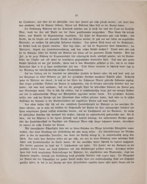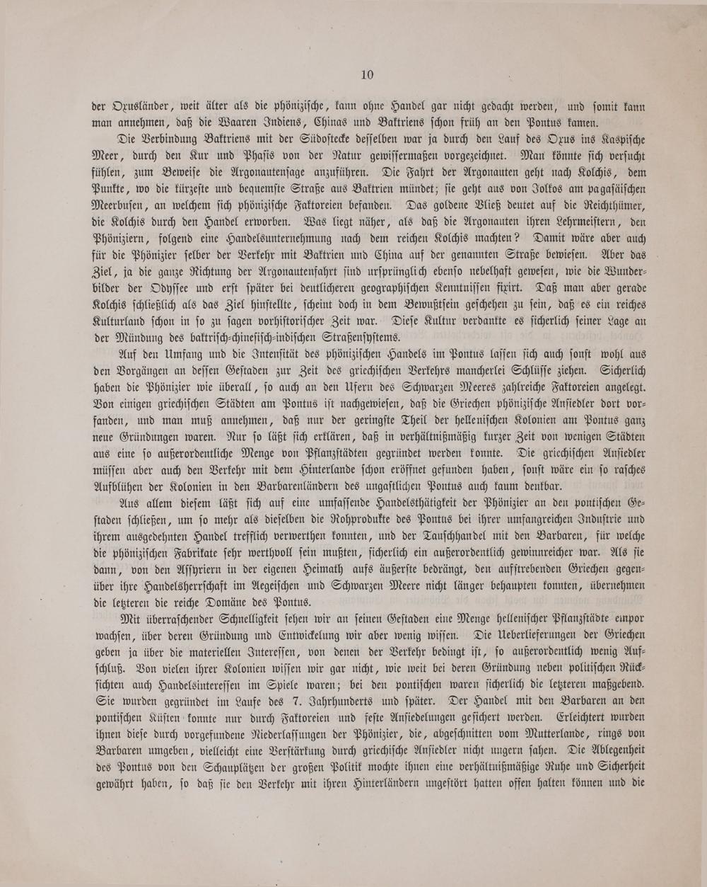 Mit überraſchender Schnelligkeit ſehen wir an ſeinen Geſtaden eine Menge helleniſcher Pflanzſtädte empor wachſen, über deren Gründung und Entwickelung wir aber wenig wiſſen. Die Ueberlieferungen der Griechen geben ja über die materiellen Intereſſen, von denen der Verkehr bedingt iſt, ſo außerordentlich wenig Auf⸗ ſchluß. Von vielen ihrer Kolonien wiſſen wir gar nicht, wie weit bei deren Gründung neben politiſchen Rück⸗ ſichten auch Handelsintereſſen im Spiele waren; bei den pontiſchen waren ſicherlich die letzteren maßgebend. Sie wurden gegründet im Laufe des 7. Jahrhunderts und ſpäter. Der Handel mit den Barbaren an den pontiſchen Küſten konnte nur durch Faktoreien und feſte Anſiedelungen geſichert werden. Erleichtert wurden ihnen dieſe durch vorgefundene Niederlaſſungen der Phönizier, die, abgeſchnitten vom Mutterlande, rings von Barbaren umgeben, vielleicht eine Verſtärkung durch griechiſche Anſiedler nicht ungern ſahen. Die Ablegenheit des Pontus von den Schauplätzen der großen Politik mochte ihnen eine verhältnißmäßige Ruhe und Sicherheit gewährt haben, ſo daß ſie den Verkehr mit ihren Hinterländern ungeſtört hatten offen halten können und die