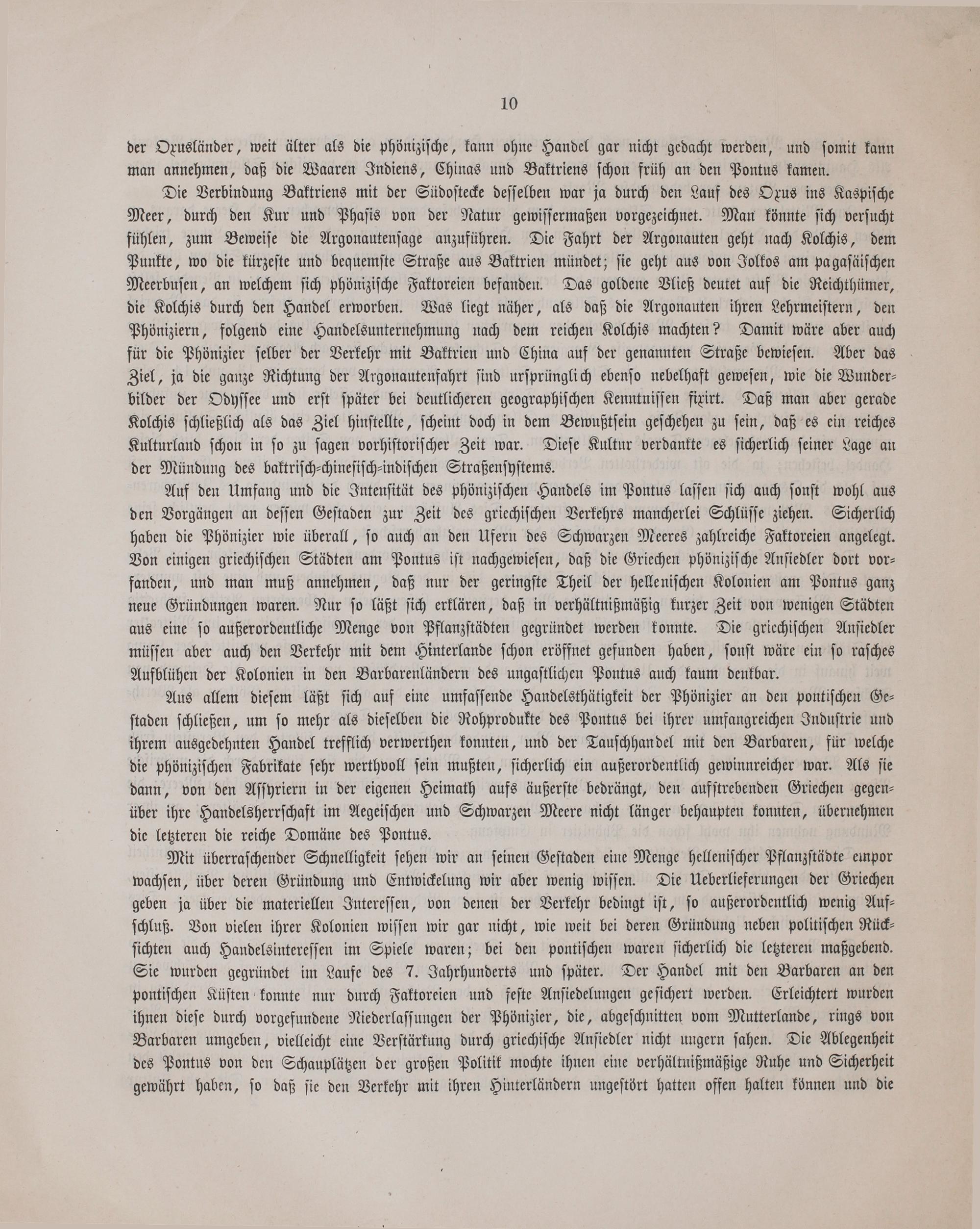 Die Verbindung Baktriens mit der Südoſtecke deſſelben war ja durch den Lauf des Oxus ins Kaspiſche Meer, durch den Kur und Phaſis von der Natur gewiſſermaßen vorgezeichnet. Man könnte ſich verſucht fühlen, zum Beweiſe die Argonautenſage anzuführen. Die Fahrt der Argonauten geht nach Kolchis, dem Punkte, wo die kürzeſte und bequemſte Straße aus Baktrien mündet; ſie geht aus von Jolkos am pagaſäiſchen Meerbuſen, an welchem ſich phöniziſche Faktoreien befanden. Das goldene Vließ deutet auf die Reichthümer, die Kolchis durch den Handel erworben. Was liegt näher, als daß die Argonauten ihren Lehrmeiſtern, den Phöniziern, folgend eine Handelsunternehmung nach dem reichen Kolchis machten? Damit wäre aber auch für die Phönizier ſelber der Verkehr mit Baktrien und China auf der genannten Straße bewieſen. Aber das Ziel, ja die ganze Richtung der Argonautenfahrt ſind urſprünglich ebenſo nebelhaft geweſen, wie die Wunder⸗ bilder der Odyſſee und erſt ſpäter bei deutlicheren geographiſchen Kenntniſſen fixirt. Daß man aber gerade Kolchis ſchließlich als das Ziel hinſtellte, ſcheint doch in dem Bewußtſein geſchehen zu ſein, daß es ein reiches Kulturland ſchon in ſo zu ſagen vorhiſtoriſcher Zeit war. Dieſe Kultur verdankte es ſicherlich ſeiner Lage an der Mündung des baktriſch⸗chineſiſch⸗indiſchen Straßenſyſtems.