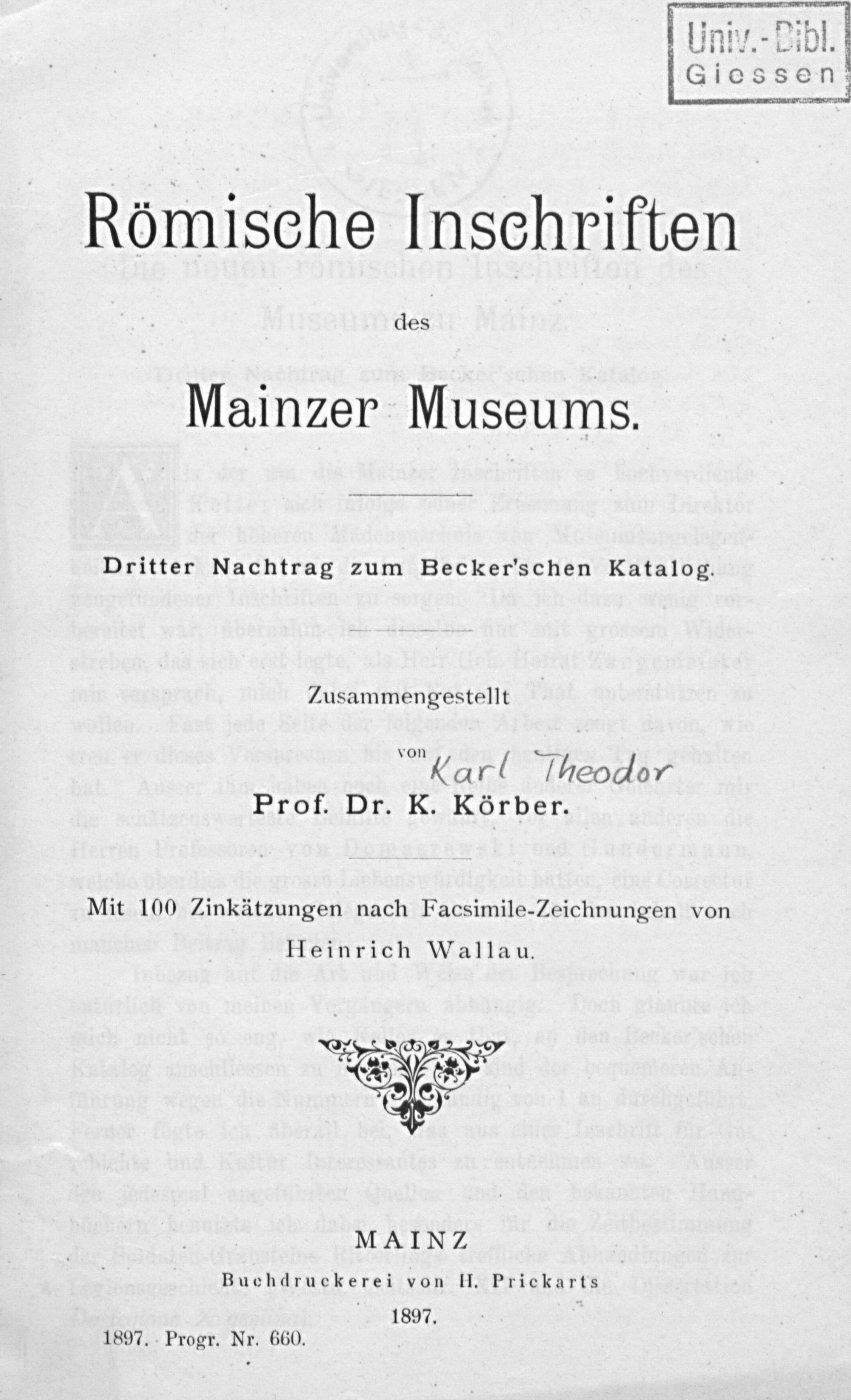3,[1] (1897) Römische Inschriften des Mainzer Museums / zsgest. von K. Körber. Mit 100 Zinkätzungen nach Faks.-Zeichn. von Heinrich Wallau
