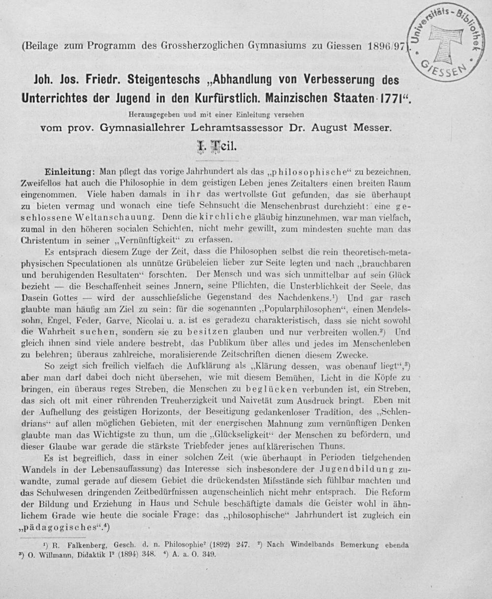 Joh. Jos. Friedr. Steigenteschs "Abhandlung von Verbesserung des Unterrichts der Jugend in den Kurfürstlich. Mainzischen Staaten 1771"
