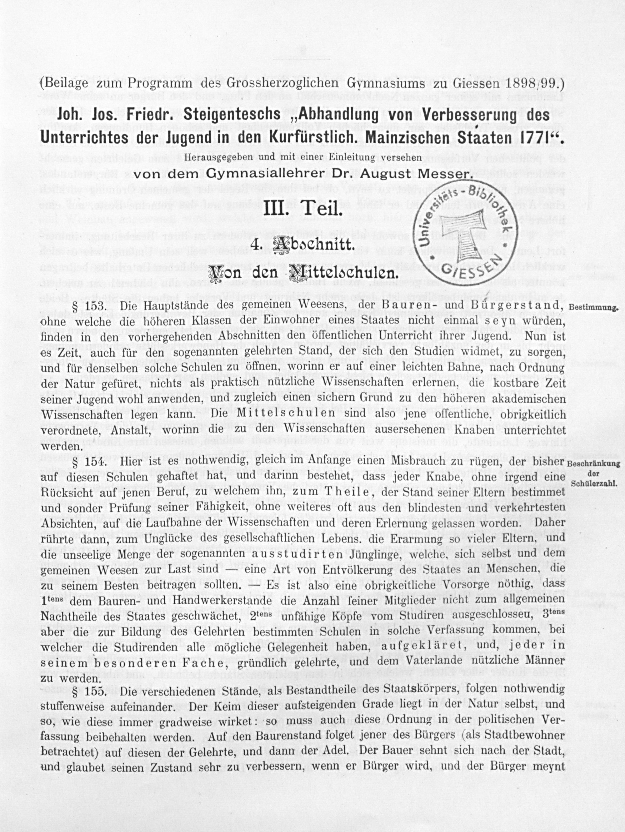Joh. Jos. Friedr. Steigenteschs "Abhandlung von Verbesserung des Unterrichts der Jugend in den Kurfürstlich. Mainzischen Staaten 1771"