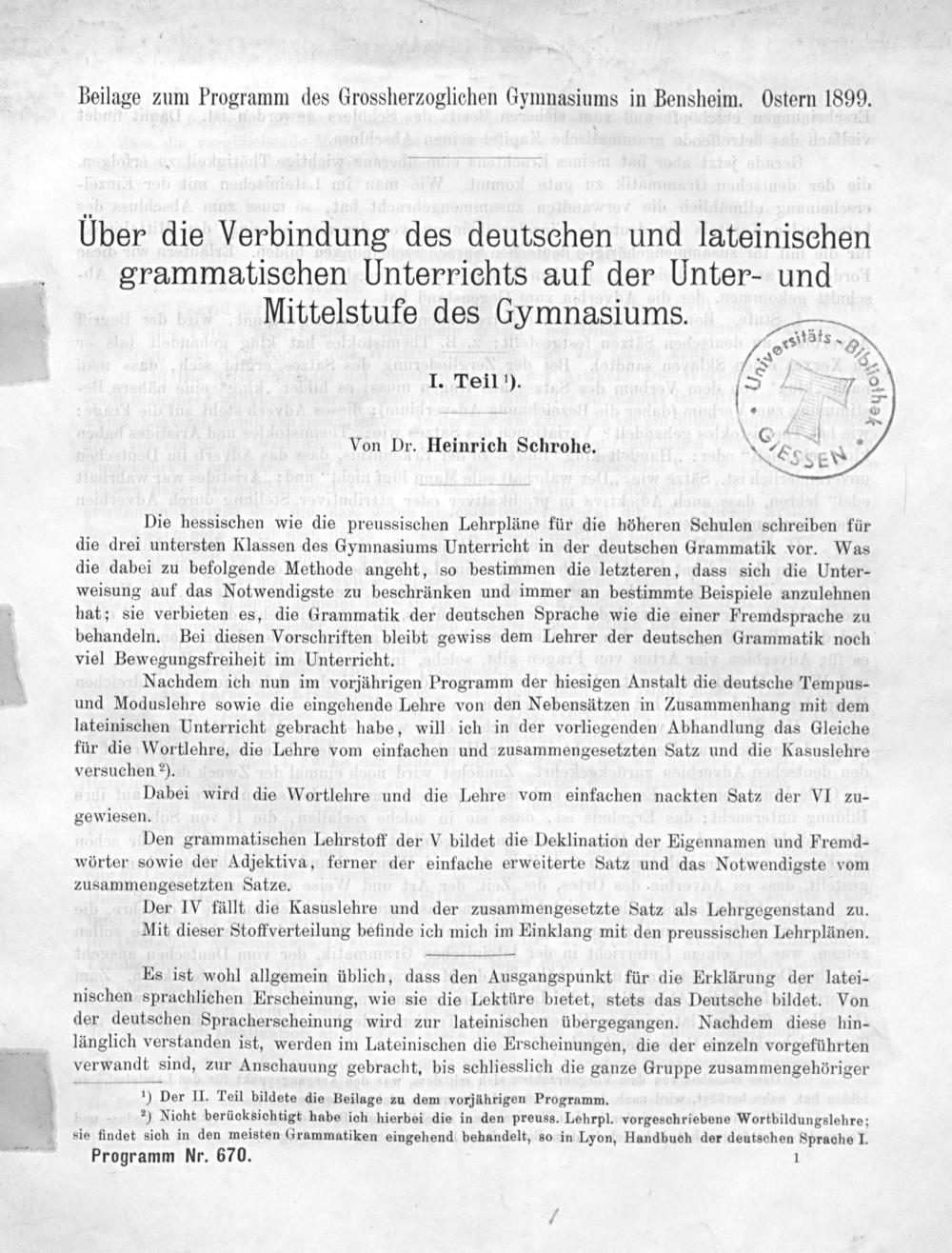 Über die Verbindung des deutschen und lateinischen grammatischen Unterrichts auf der Unter- und Mittelstufe des Gymnasiums