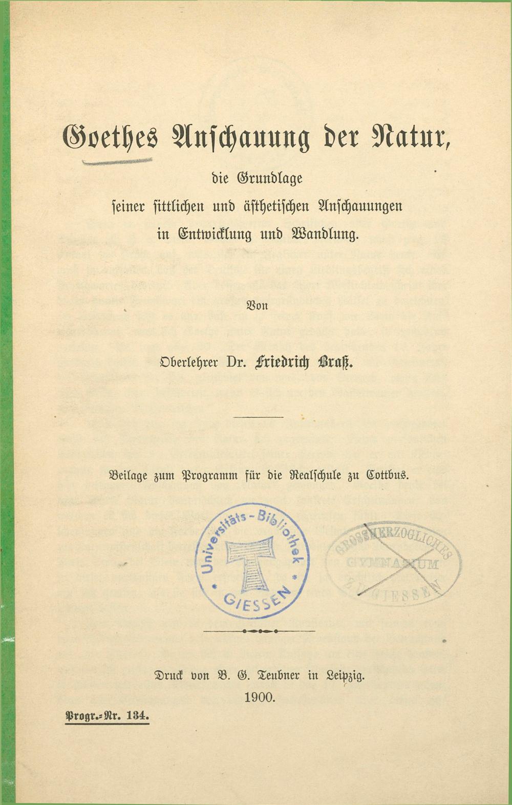 Goethes Anschauung der Natur, die Grundlage seiner sittlichen und ästhetischen Anschauungen in Entwicklung und Wandlung / von Oberlehrer Dr. Friedrich Braß