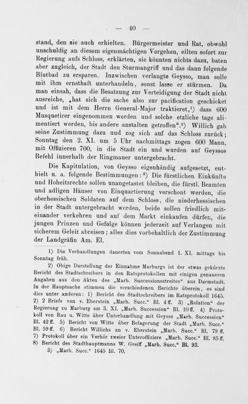 2) Obige Darstellung der Einnahme Marburgs ist der etwas gekürzte Bericht des Stadtschreibers in den Ratsprotokollen mit einigen genaueren Angaben aus den Akten des„Marb. Successionsstreites“ aus Darmstadt. In der Hauptsache stimmen die verschiedenen Berichte überein, es sind dies unter anderen: 1) Bericht des Stadtschreibers im Ratsprotokoll 1645. 2) 2 Briefe von v. Eberstein„Marb. Succ.“ Bl. 4 ff. 3)„Relation“ der Regierung zu Marburg am 3. XI.„Marb. Succession“ Bl. 10 fl. 4) Proto- koll von Rau u. Witte über Unterhandlung mit Geysso„Marb. Succession“ Bl. 42 fl. 5) Bericht von Witte über Belagerung der Stadt„Marb. Succ.“ Bl. 59 ff. 6) Bericht Willichs an v. Eberstein„Marb. Succ.“ Bl. 79 ff. 7) Protokoll über ein Verhör zweier Unteroffiziere„Marb. Succ.“ Bl. 85 ff. 8) Bericht des Stadthauptmanns W. Greiff„Marb. Succ.“ Bl. 93.