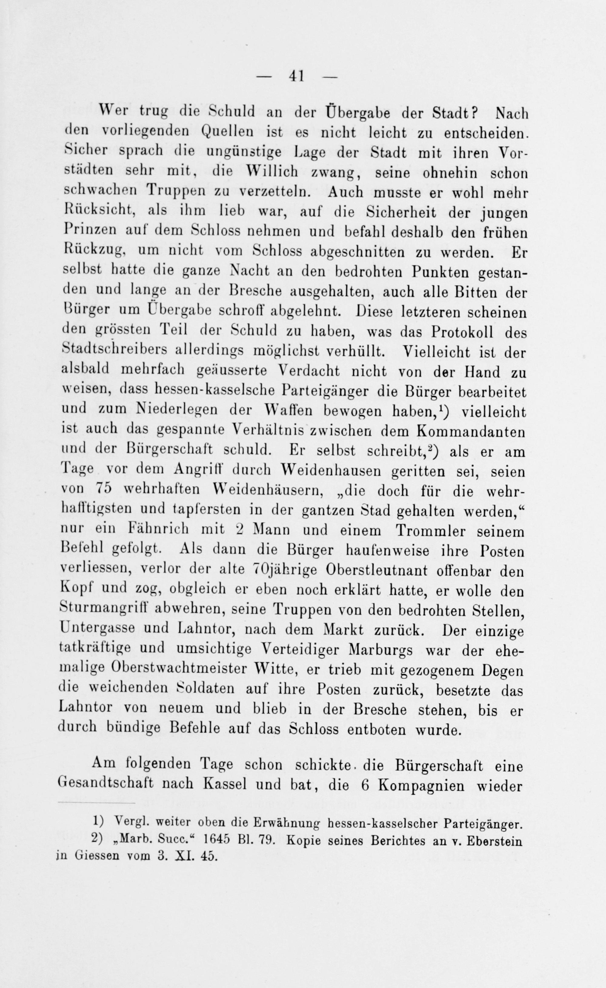 1) Vergl. weiter oben die Erwähnung hessen-kasselscher Parteigänger. 2)„Marb. Succ.“ 1645 Bl. 79. Kopie seines Berichtes an v. Eberstein in Giessen vom 3. XI. 45.