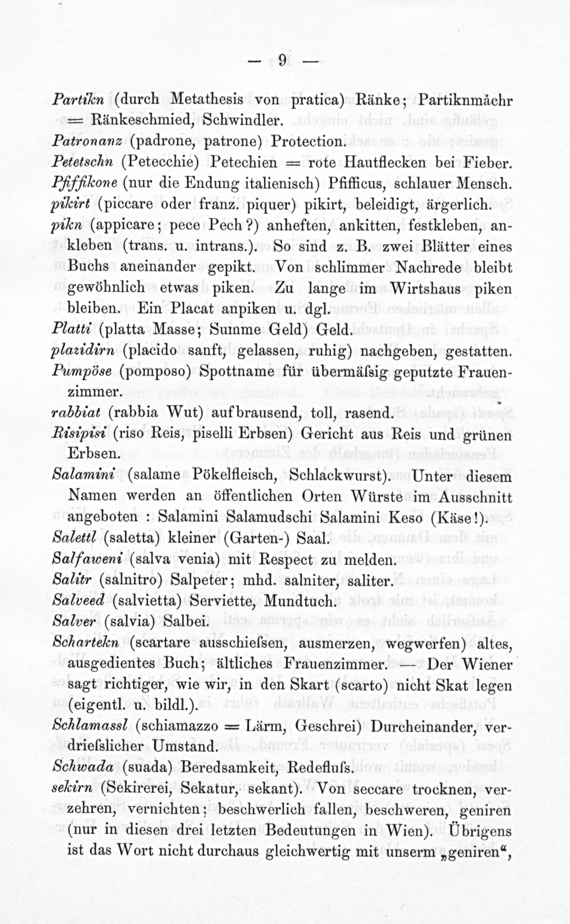 sekirn(Sekirerei, Sekatur, sekant). Von seccare trocknen, ver- zehren, vernichten; beschwerlich fallen, beschweren, geniren (nur in diesen drei letzten Bedeutungen in Wien). Ubrigens ist das Wort nicht durchaus gleichwertig mit unserm„geniren“,