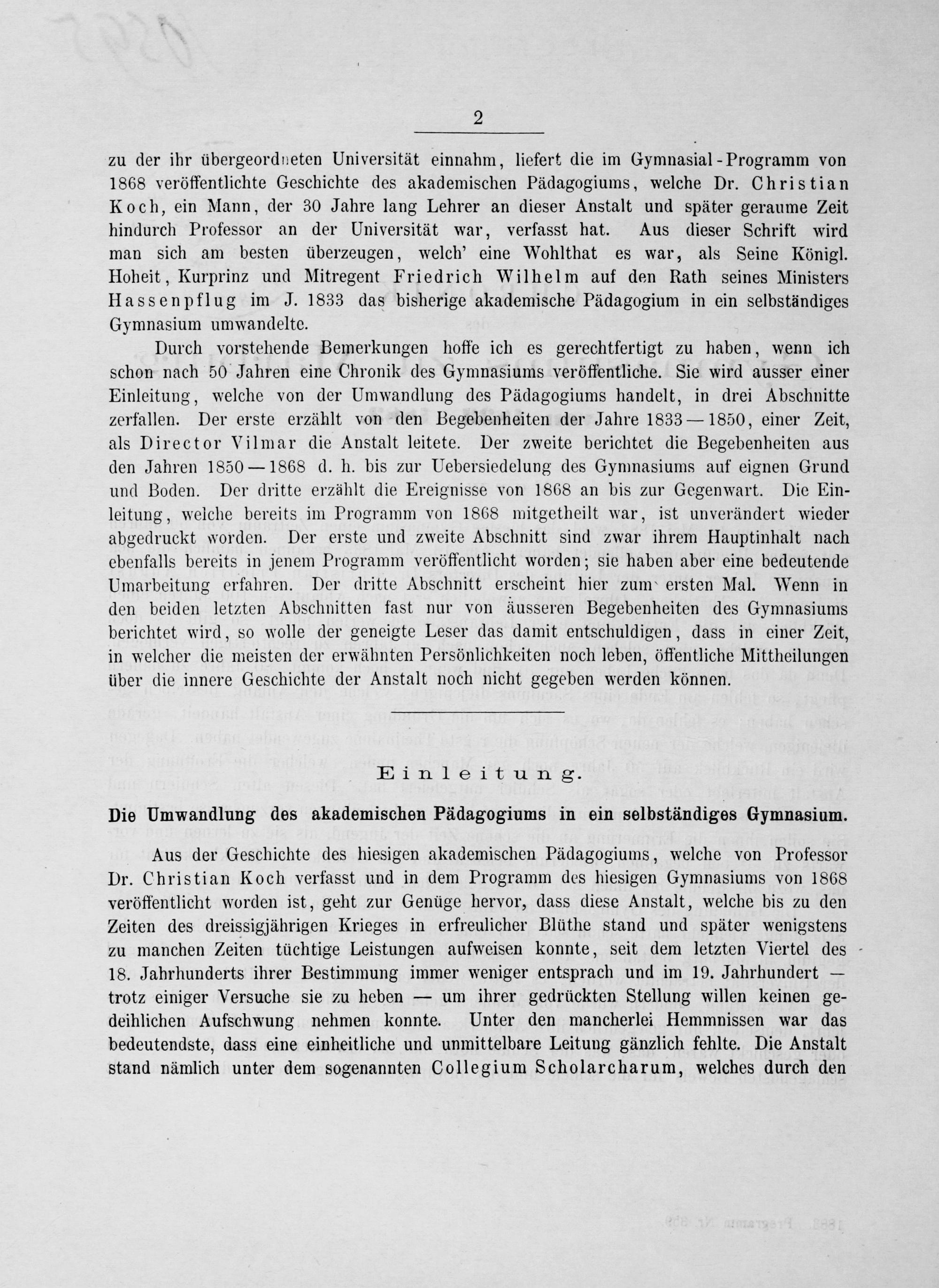 zu der ihr übergeordneten Universität einnahm, liefert die im Gymnasial-Programm von 1868 veröffentlichte Geschichte des akademischen Pädagogiums, welche Dr. Christian Koch, ein Mann, der 30 Jahre lang Lehrer an dieser Anstalt und später geraume Zeit hindurch Professor an der Universität war, verfasst hat. Aus dieser Schrift wird man sich am besten überzeugen, welch' eine Wohlthat es war, als Seine Königl. Hoheit, Kurprinz und Mitregent Friedrich Wilhelm auf den Rath seines Ministers Hassenpflug im J. 1833 das bisherige akademische Pädagogium in ein selbständiges Gymnasium umwandelte.