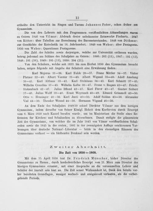 An dem Ende des Schuljahrs 1849/50 schied Direktor Vilmar aus dem hiesigen Gymnasium, indem derselbe von Seiner Königl. Hoheit dem Kurfürsten durch Rescript vom 8. März 1850 nach Kassel berufen wurde, um im Ministerium die Stelle eines Re- ferenten für Kirchen- und Schulsachen zu übernehmen. Damit endigte die glänzendste Zeit des Gymnasiums, von welcher die im Jahr 1843 von Vilmar veröffentlichten Schul- reden sowie die 1845 in der ersten, 1881 in der zwanzigsten Auflage erschienenen Vor- lesungen über deutsche National-Literatur— beide in den ehemaligen Räumen des Gymnasiums verfasst— ein bleibendes Denkmal sein werden.