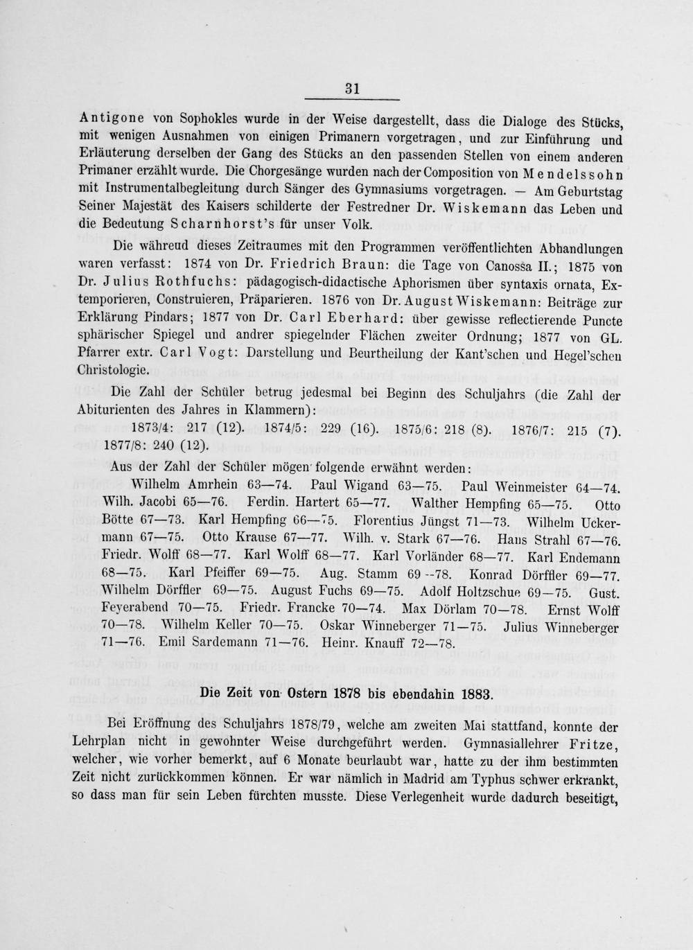 Antigone von Sophokles wurde in der Weise dargestellt, dass die Dialoge des Stücks, mit wenigen Ausnahmen von einigen Primanern vorgetragen, und zur Einführung und Erläuterung derselben der Gang des Stücks an den passenden Stellen von einem anderen Primaner erzählt wurde. Die Chorgesänge wurden nach der Composition von Mendelssohn mit Instrumentalbegleitung durch Sänger des Gymnasiums vorgetragen.— Am Geburtstag Seiner Majestät des Kaisers schilderte der Festredner Dr. Wiskemann das Leben und die Bedeutung Scharnhorst's für unser Volk.