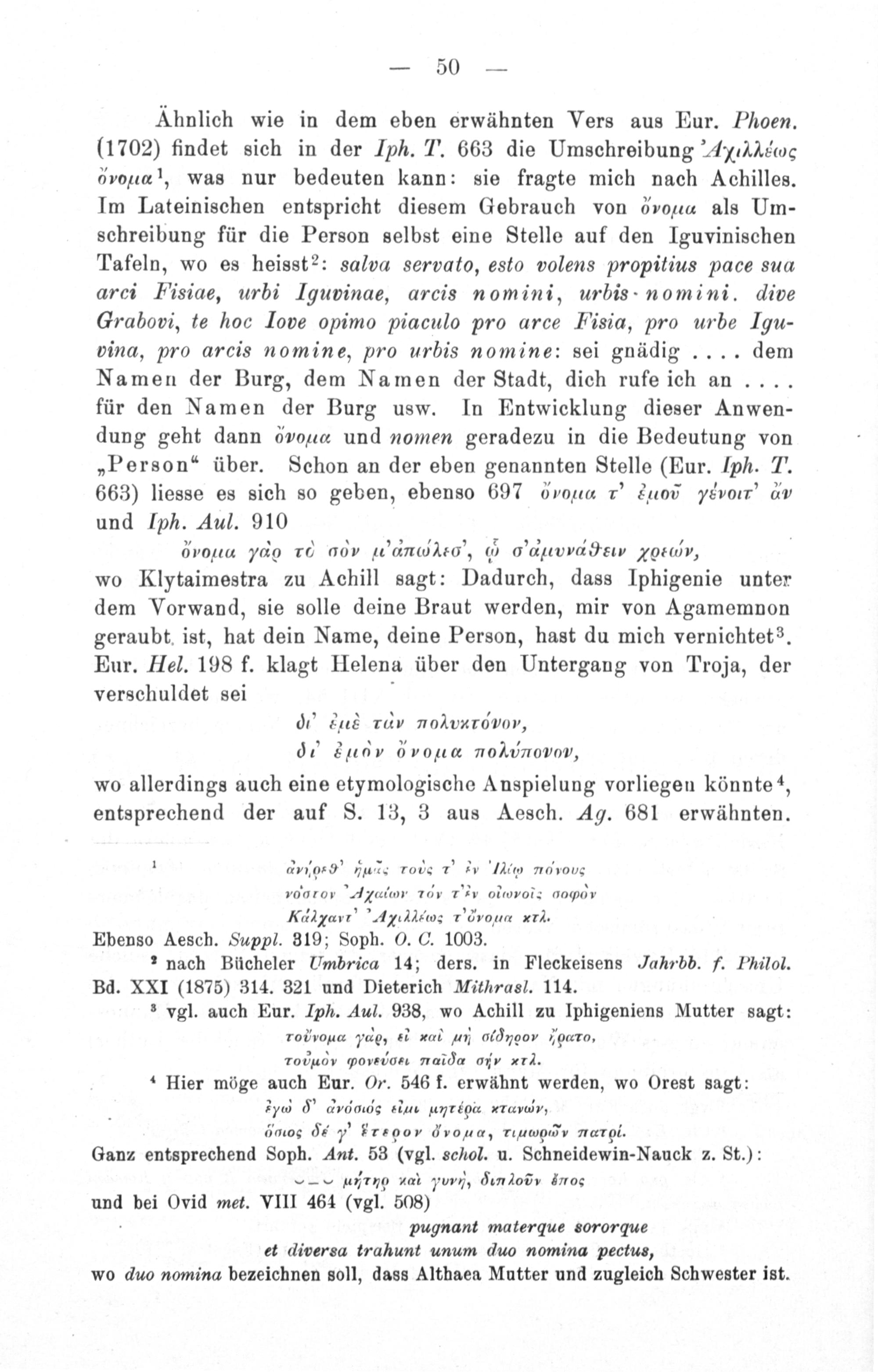 Khnlich wie in dem eben erwähnten Vers aus Eur. Phoen. (1702) findet sich in der Iph. T. 663 die Umschreibung ε⁴ιμιοα 6„μαάα was nur bedeuten kann: sie fragte mich nach Achilles. Im Lateinischen entspricht diesem Gebrauch von 6 ̈᷑ als Um- schreibung für die Person selbst eine Stelle auf den Iguvinischen Tafeln, wo es heisst?: salva servato, esto volens propitius pace sua arci Fisiae, urbi Iguvinae, arcis nomini, urbis- nomini. dive Grabovi, te hoc Iove opimo piaculo pro arce Fisia, pro urbe Igu- vina, pro arcis nomine, pro urbis nomine: sei gnädig.... dem Namen der Burg, dem Namen der Stadt, dich rufe ich an.... für den Namen der Burg usw. In Entwicklung dieser Anwen- dung geht dann övouæ und nomen geradezu in die Bedeutung von „Person“ über. Schon an der eben genannten Stelle(Eur. Iph. T. 663) liesse es sich so geben, ebenso 697 b οιόχ τ Ʒιαα Jeνorr' dν und Iph. Aul. 910