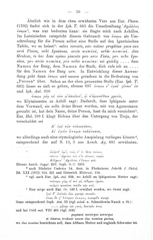 1 dννοσςσ* ςᷣ τοdςα τν ειν πσσουεσ roοτο ioον τνινννουωο 909 Kdlgarr' Ageo r'drouk vrä. Ebenso Aesch. Suppl. 319; Soph. O. C. 1003. ²2 nach Bücheler Umbrica 14; ders. in Fleckeisens Jahrbb. f. Philol. Bd. XXI(1875) 314. 321 und Dieterich Mithrasl. 114. 3 vgl. auch Eur. Iph. Aul. 938, wo Achill zu Iphigeniens Mutter sagt: rouννοιασα—ν⁴n,& ea u ddνοον νρμάσ T0b,⁴μςαν ρονεᷣiαe παηάα o. * Hier möge auch Eur. Or. 546 f. erwähnt werden, wo Orest sagt: 2yνƷ"drα⁴ς εuν νεμνα rανr, 6αισσο ςε p ErOν eοω, riαb³νσν π&νgi. Ganz entsprechend Soph. Ant. 53(vgl. schol. u. Schneidewin-Nauck z. St.): 2” 1*179 val* pvnn, dn 1odν Ʒνπτποτ und bei Ovid met. VIII 464(vgl. 508) . pugnant matergue sororque et diversa trahunt unum duo nomina pectus, wo duo nomina bezeichnen soll, dass Althaea Mutter und zugleich Schwester ist.