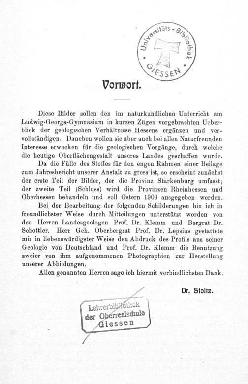 Diese Bilder sollen den im naturkundlichen Unterricht am Ludwig-Georgs-Gymnasium in kurzen Zügen vorgebrachten Ueber- blick der geologischen Verhältnisse Hessens ergänzen und ver- vollständigen. Daneben wollen sie aber auch bei allen Naturfreunden Interesse erwecken für die geologischen Vorgänge, durch welche die heutige Oberflächengestalt unseres Landes geschaffen wurde.