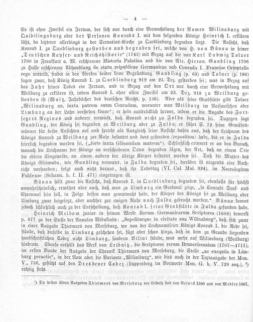 Heinrich Meibom junior in ſeinem Werke Rerum Germanicarum Scriptores(1688) bemerkt p. 677 zu der Stelle der Annalen Widukinds:„Sepeliturque in civitate sua Wilinaburg“, daß ſich zwar in einer Ausgabe Thietmars von Merſeburg, wo von der Leichnamsfeier Königs Konrad I. die Rede ſei, ſtände, daß dieſelbe in Limburg geſchehen ſei, fügt aber ſchon hinzu, daß in dem zu Grunde liegenden handſchriftlichen Codex nicht Limburg, ſondern Vilini ſtände, was mehr auf Wilinaburg(Weilburg) hindeute. Ebenſo enthält das Werk von Leibnitz, die Scriptores rerum Brunsvicensium(1707— 1711), im erſten Bande der Ausgabe der Chronik Thietmars von Merſeburg, die Stelle„ac exequiis in Lim- burg peractis“, in der Note aber die Variante„Wiliniburg“, wie dies auch in der Textausgabe der Mon. V., 736, geſtützt auf den Dres dener Codex(Lappenberg im Vorworte Mon. G. h. V. 729 seq.), ¹) richtig ſteht.