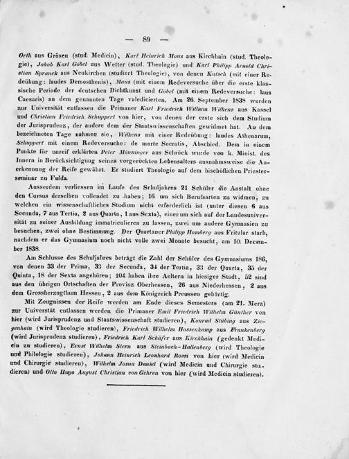 Orth aus Gräsen(stud. Medicin), Karl Heinrich Maus aus Kirchhain(stud. Theolo- gie), Jakob Karl Göbel aus Wetter(stud. Theologie) und Karl Philipp Arnold Chri- slian Spranck aus Neukirchen(studiert Theologie), von denen Kutsch(mit einer Re- deübung: laudes Demosthenis), Maus(mit einem Redeversuche über die erste klas- sische Periode der deutschen Dichtkunst und Gobel(mit einem Redeversuche: laus Caesaris) an dem genannten Tage valedicierten. Am 26. September 1838 wurden zur Universität entlassen die Primaner Karl Friedrich William Wilrens aus Kassel und Christian Friedrich Schuppert von hier, von denen der erste sich dem Studium der Jurisprudenz, der andere dem der Staatswissenschaften gewidmet hat. Au dem bezeichneten Tage nahmen sie, yilkens mit einer Redeübung: laudes Athenarum, Schuppert mit einem Redeversuche: de morte Socratis, Abschied. Dem in einem Punkte für unreif erklärten Pefer Mönninger aus Schröck wurde von k. Minist. des Innern in Berücksichtigung seines vorgerückten Lebensalters ausnahmsweise die An- erkennung der Reife gewährt. Er studiert Theologie auf dem bischöflichen Priester- seminar zu Fulda.