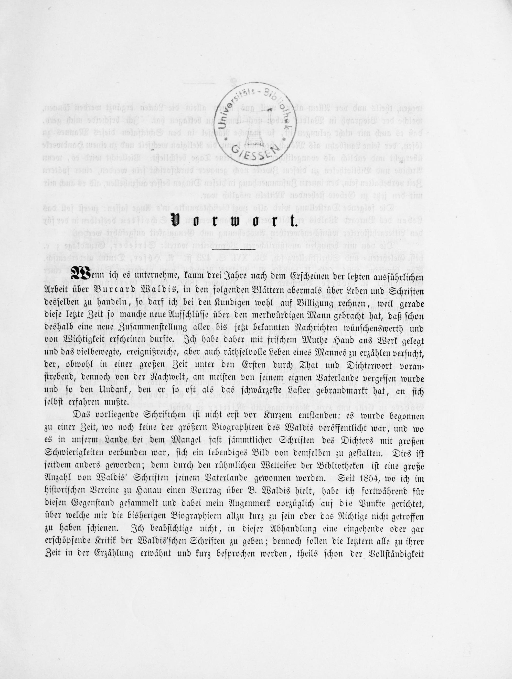 Das vorliegende Schriftchen iſt nicht erſt vor Kurzem entſtanden: es wurde begonnen zu einer Zeit, wo noch keine der größern Biographieen des Waldis veröffentlicht war, und wo es in unſerm Lande bei dem Mangel faſt ſämmtlicher Schriften des Dichters mit großen Schwierigkeiten verbunden war, ſich ein lebendiges Bild von demſelben zu geſtalten. Dies iſt ſeitdem anders geworden; denn durch den rühmlichen Wetteifer der Bibliotheken iſt eine große Anzahl von Waldis' Schriften ſeinem Vaterlande gewonnen worden. Seit 1854, wo ich im hiſtoriſchen Vereine zu Hanau einen Vortrag über B. Waldis hielt, habe ich fortwährend für dieſen Gegenſtand geſammelt und dabei mein Augenmerk vorzüglich auf die Punkte gerichtet, über welche mir die bisherigen Biographieen allzu kurz zu ſein oder das Richtige nicht getroffen zu haben ſchienen. Ich beabſichtige nicht, in dieſer Abhandlung eine eingehende oder gar erſchöpfende Kritik der Waldis'ſchen Schriften zu geben; dennoch ſollen die letztern alle zu ihrer Zeit in der Erzählung erwähnt und kurz beſprochen werden, theils ſchon der Vollſtändigkeit