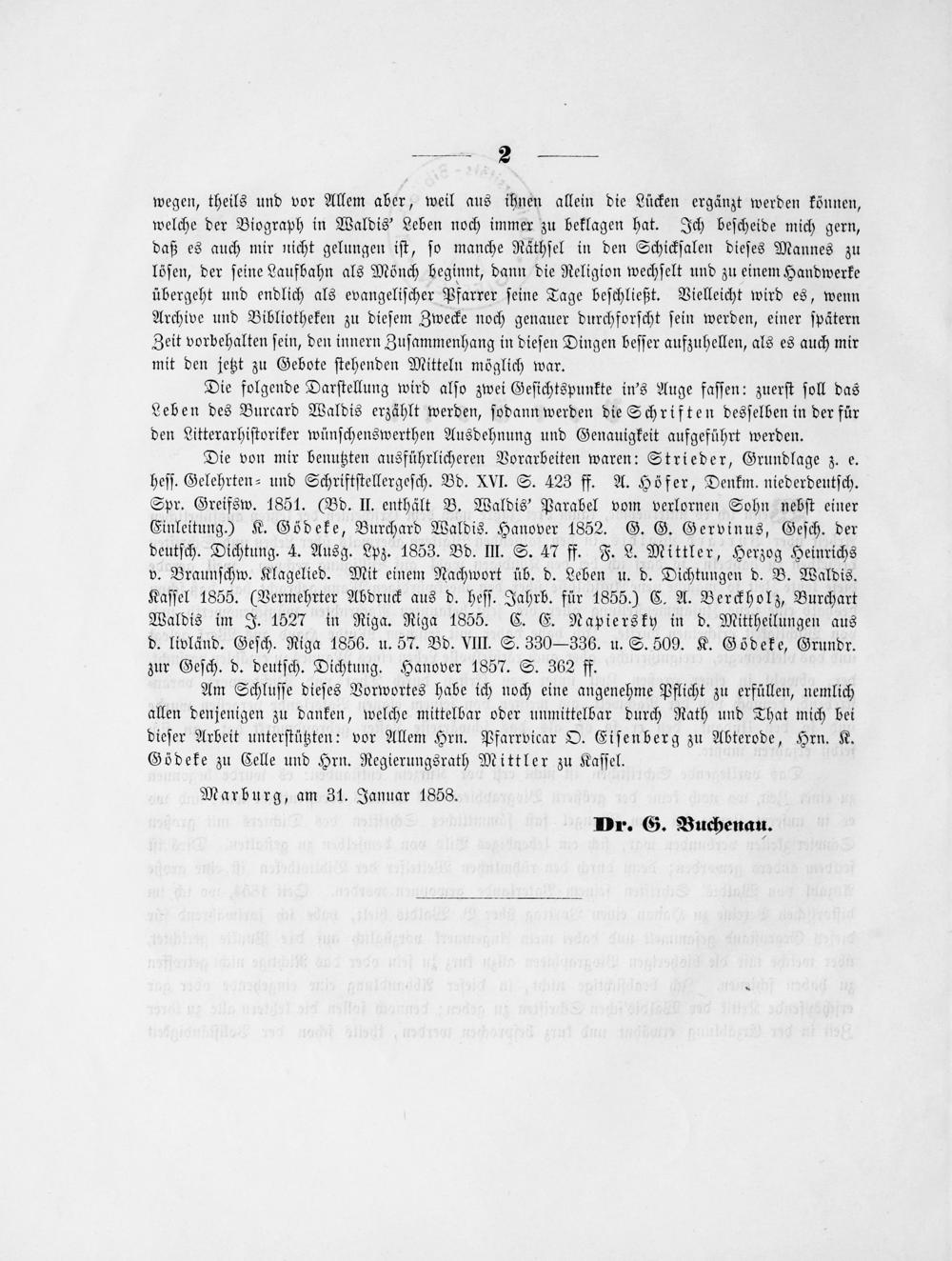 Die folgende Darſtellung wird alſo zwei Geſichtspunkte in's Auge faſſen: zuerſt ſoll das Leben des Burcard Waldis erzählt werden, ſodann werden die Schriften desſelben in der für den Litterarhiſtoriker wünſchenswerthen Ausdehnung und Genauigkeit aufgeführt werden.