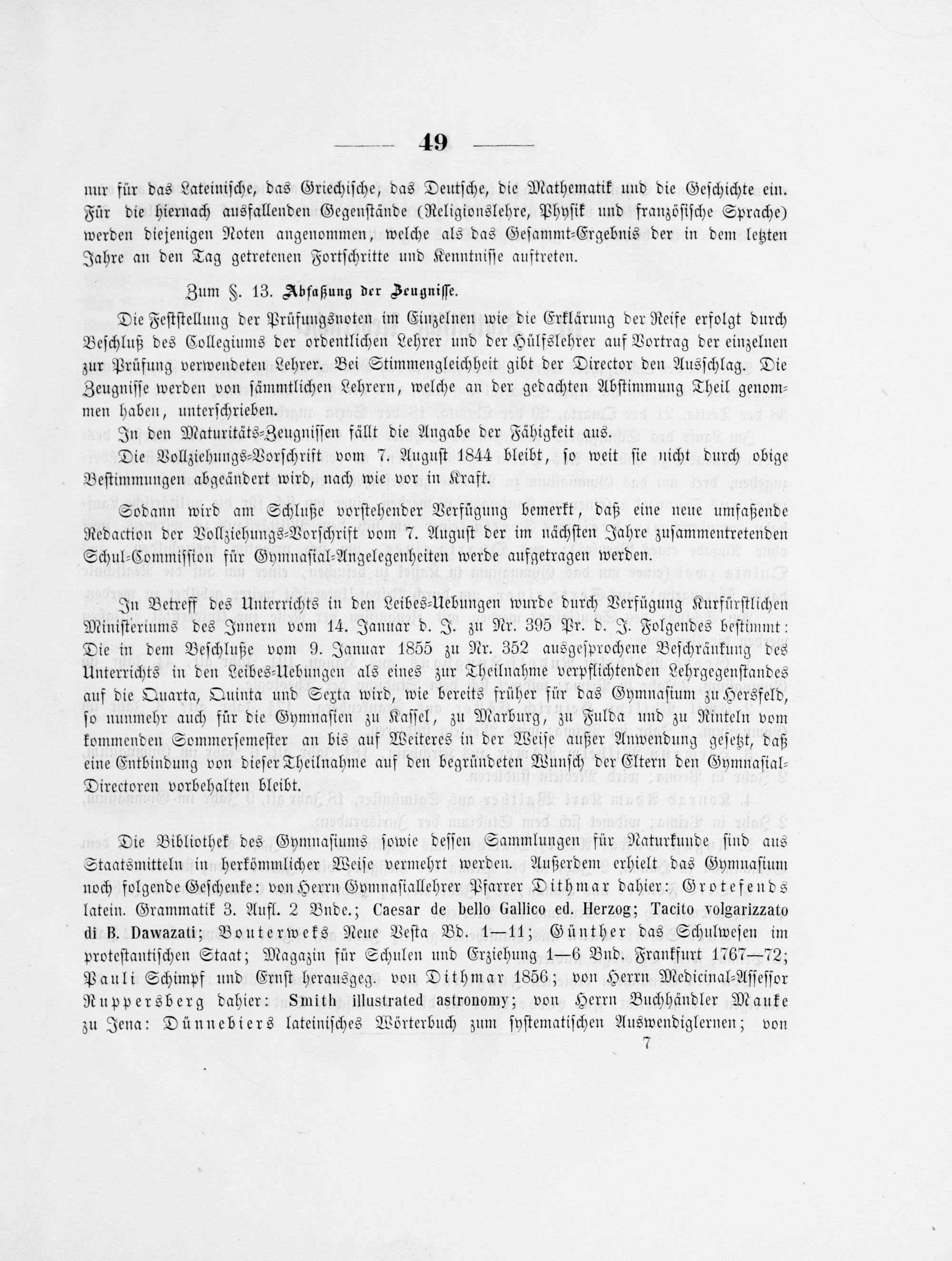 Die Bibliothek des Gymnaſiums ſowie deſſen Sammlungen für Naturkunde ſind aus Staatsmitteln in herkömmlicher Weiſe vermehrt werden. Außerdem erhielt das Gymnaſium noch folgende Geſchenke: von Herrn Gymnaſiallehrer Pfarrer Dithmar dahier: Grotefends latein. Grammatik 3. Aufl. 2 Bunde.; Caesar de bello Gallico ed. Herzog; Tacito volgarizzato di B. Dawazati; Bouterweks Neue Veſta Bd. 1—11; Günther das Schulweſen im proteſtantiſchen Staat; Magazin für Schulen und Erziehung 1—6 Bud. Frankfurt 1767—72; Pauli Schimpf und Ernſt herausgeg. von Dithmar 1856; von Herrn Medicinal⸗Aſſeſſor Ruppersberg dahier: Smith illustrated astronomy; von Herrn Buchhändler Mauke