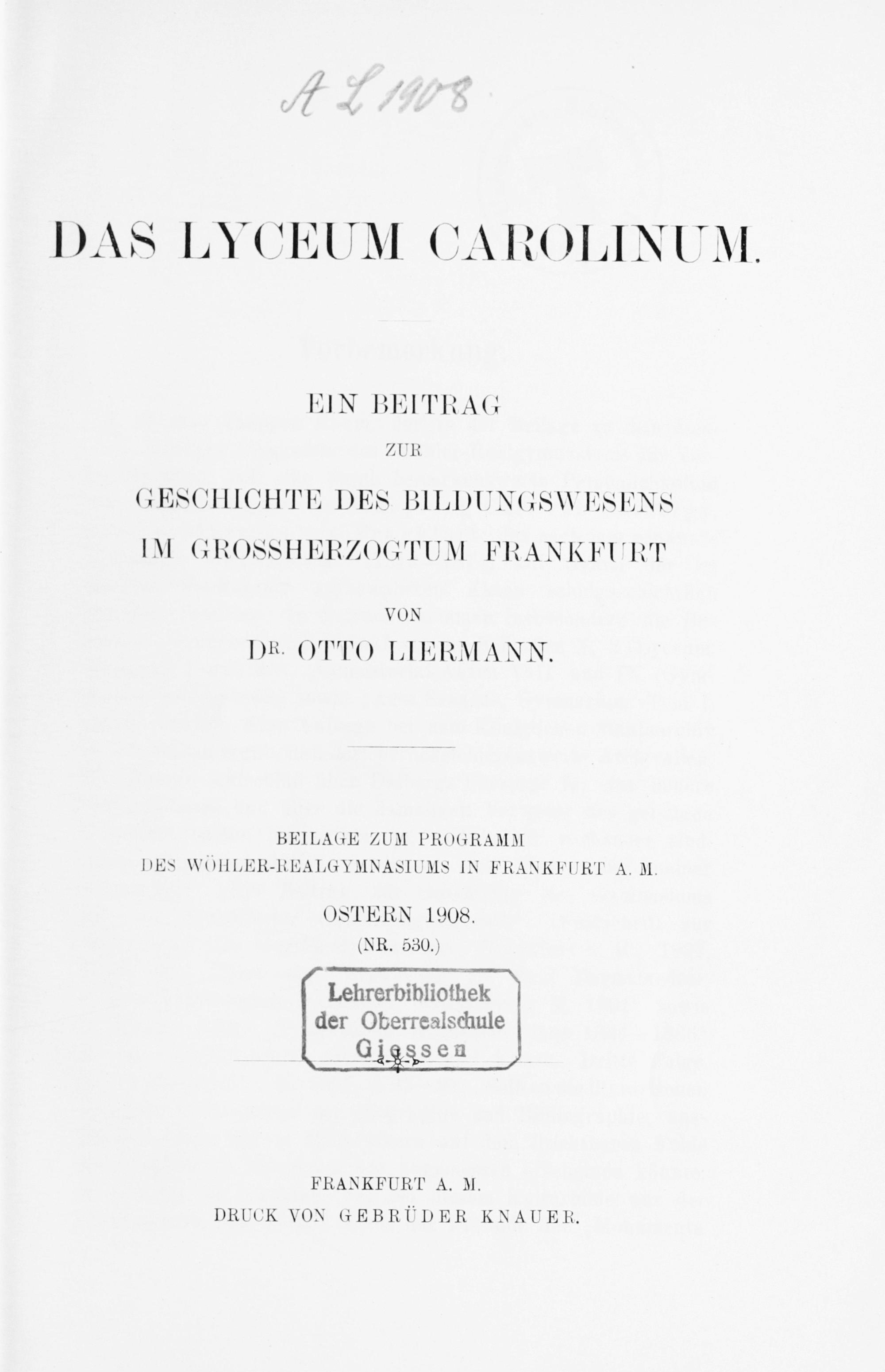 EIN BEITRAG 2UR GESCHICHTE DES BILDUNGSWESENS IM GROSSHER7OGTUM FRANRKFURT†