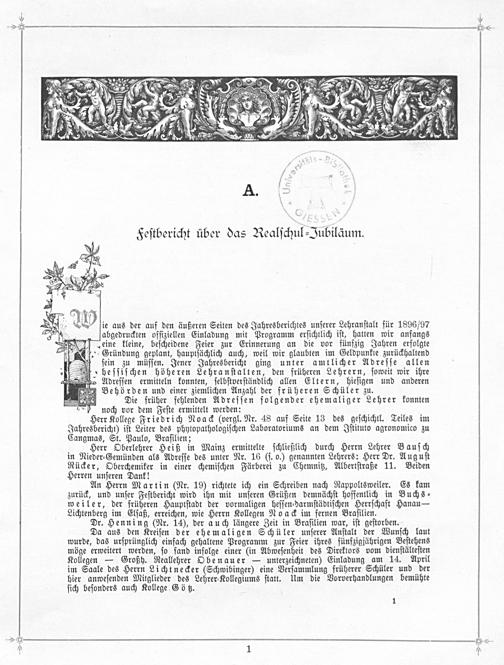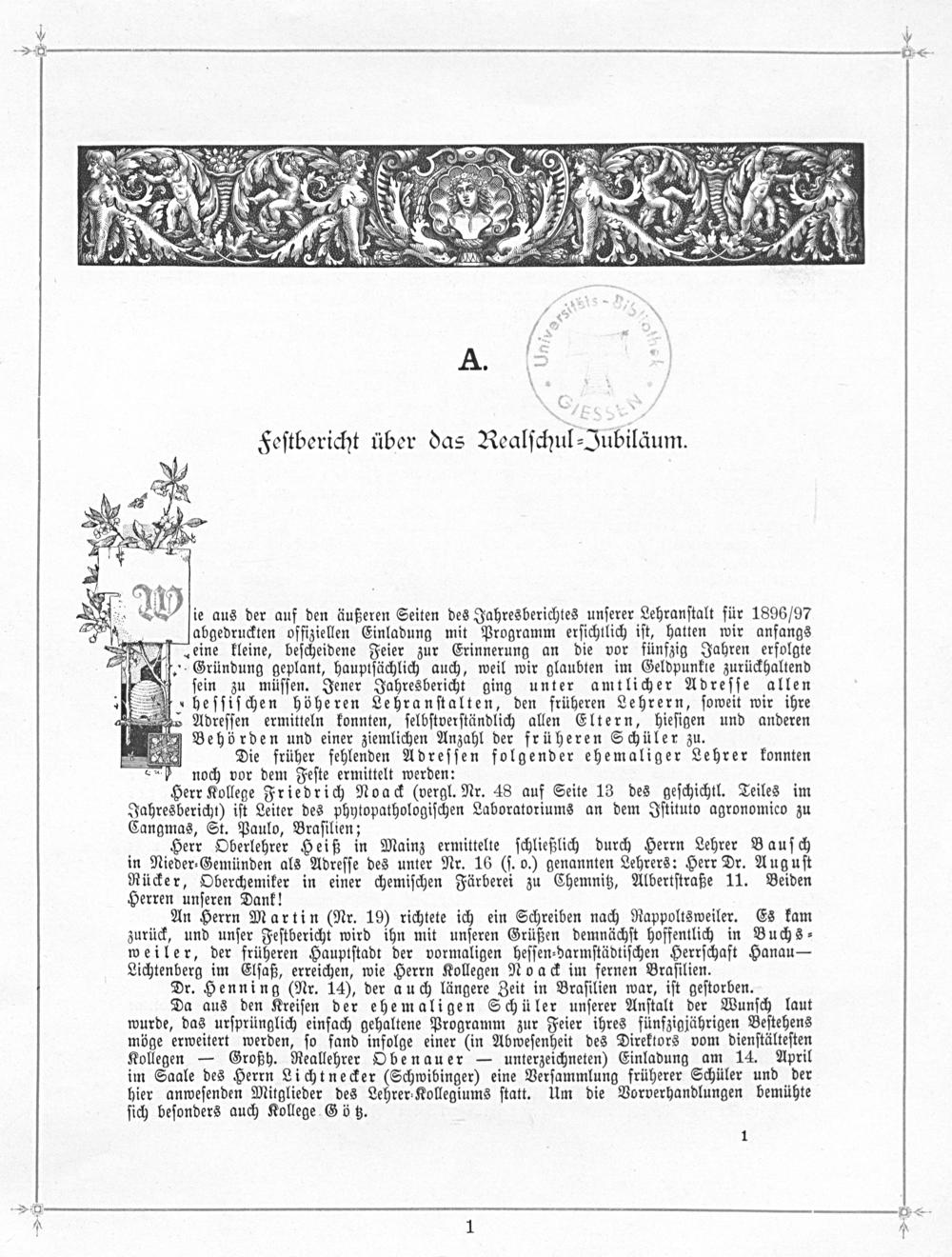 ie aus der auf den äußeren Seiten des Jahresberichtes unſerer Lehranſtalt für 1896/97 abgedruckten offiziellen Einladung mit Programm erſichtlich iſt, hatten wir anfangs eine kleine, beſcheidene Feier zur Erinnerung an die vor fünfzig Jahren erfolgte
