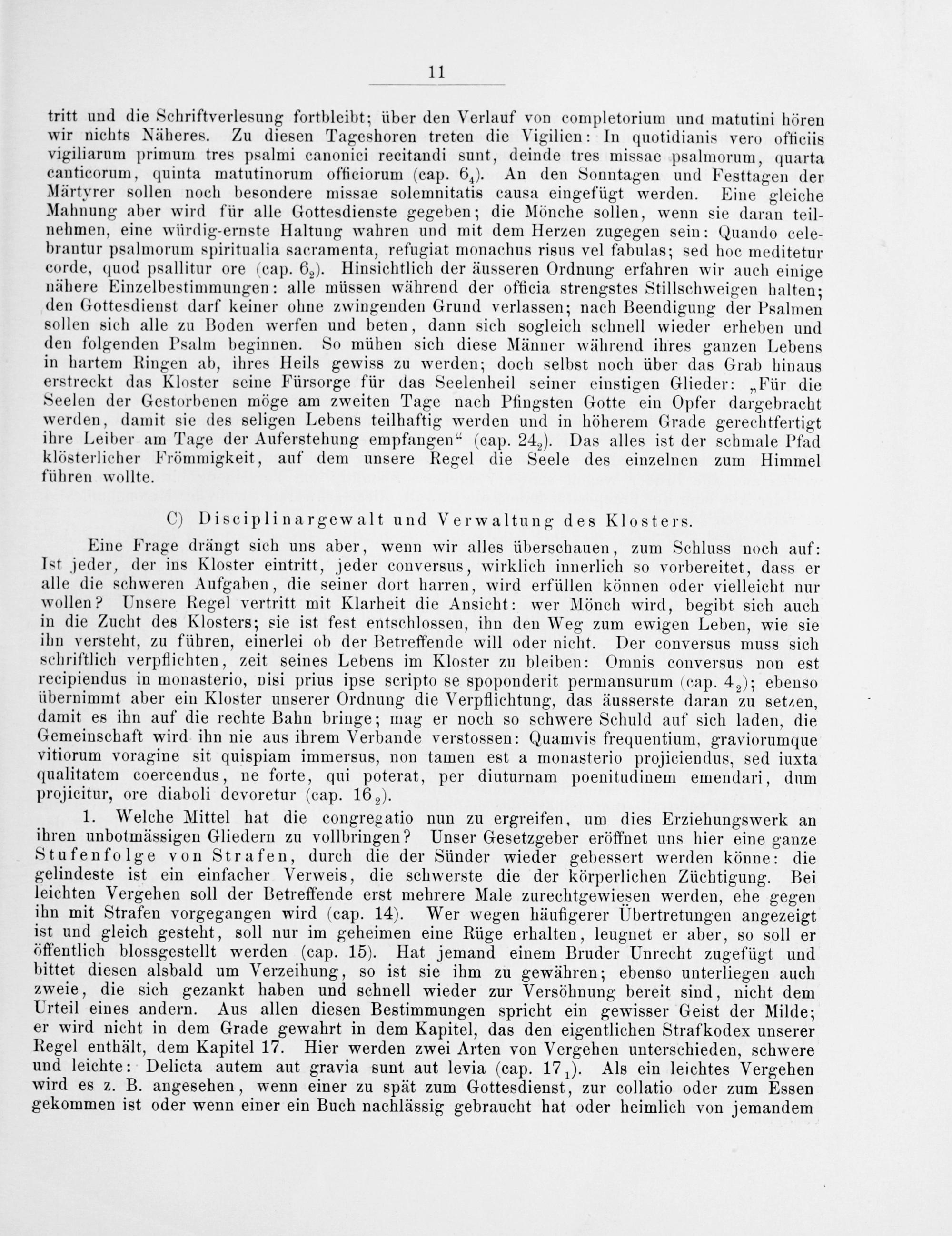 tritt und die Schriftverlesung fortbleibt; über den Verlauf von completorium und matutini hören wir nichts Näheres. Zu diesen Tageshoren treten die Vigilien: In quotidianis vero ofticiis vigiliarum primum tres psalmi canonici recitandi sunt, deinde tres missae psalmorum, quarta canticorum, quinta matutinorum officiorum(cap. 6,). An den Sonntagen und Festtagen der Märtyrer sollen noch besondere missae solemnitatis causa eingefügt werden. Eine gleiche Mahnung aber wird für alle Gottesdienste gegeben; die Mönche sollen, wenn sie daran teil- nehmen, eine würdig-ernste Haltung wahren und mit dem Herzen zugegen sein: Quando cele- brantur psalmorum spiritualia sacramenta, refugiat monachus risus vel fabulas; sed hoc meditetur corde, quod psallitur ore(cap. 62)! Hinsichtlich der äusseren Ordnung erfahren wir auch einige nähere Einzelbestimmungen: alle müssen während der officia strengstes Stillschweigen halten; den Gottesdienst darf keiner ohne zwingenden Grund verlassen; nach Beendigung der Psalmen sollen sich alle zu Boden werfen und beten, dann sich sogleich schnell wieder erheben und den folgenden Psalm beginnen. So mühen sich diese Männer während ihres ganzen Lebens in hartem Ringen ab, ihres Heils gewiss zu werden; doch selbst noch über das Grab hinaus erstreckt das Kloster seine Fürsorge für das Seelenheil seiner einstigen Glieder:„Für die Seelen der Gestorbenen möge am zweiten Tage nach Pfingsten Gotte ein Opfer dargebracht werden, damit sie des seligen Lebens teilhaftig werden und in höherem Grade gerechtfertigt ihre Leiber am Tage der Auferstehung empfangen“(cap. 24,). Das alles ist der schmale Pfad klösterlicher Frömmigkeit, auf dem unsere Regel die Seele des einzelnen zum Himmel