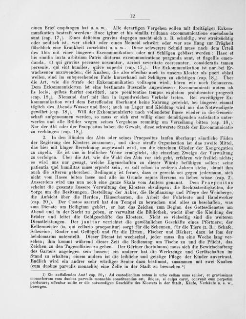1) Ein auffallendes Amt! cap. 204: Ad custodiendam autem in urbe cellam unus senior, et gravissimus monachorum cum duobus parvulis monachis constituendus est, ibique, si culpa caret, convenit eum perpetim perdurare; offenbar sollte er die notwendigen Geschäfte des Klosters in der Stadt, Käufe, Verkäufe u. s. w., besorgen.