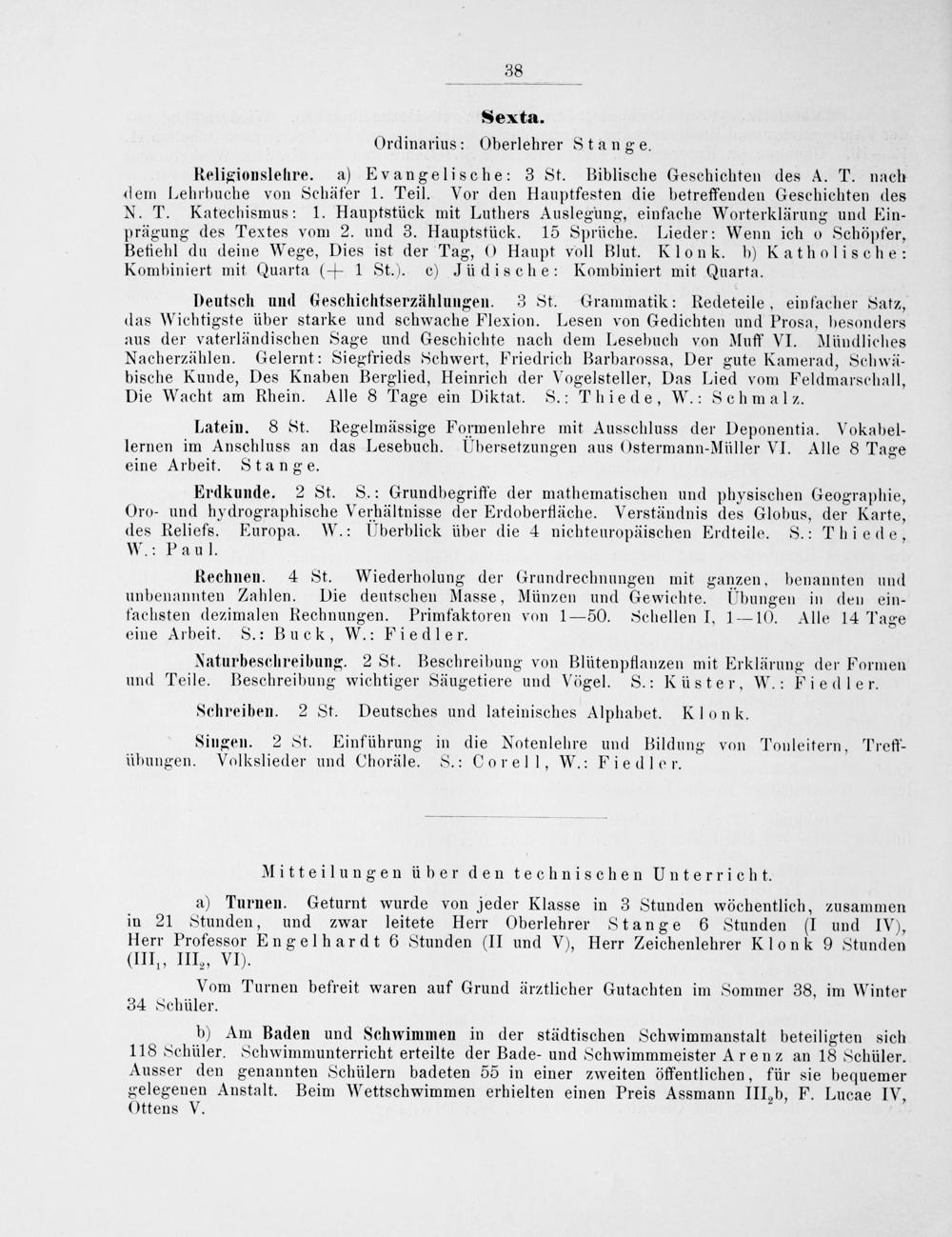 a) Turnen. Geturnt wurde von jeder Klasse in 3 Stunden wöchentlich, zusammen in 21 Stunden, und zwar leitete Herr Oberlehrer Stange 6 Stunden(I und IV),