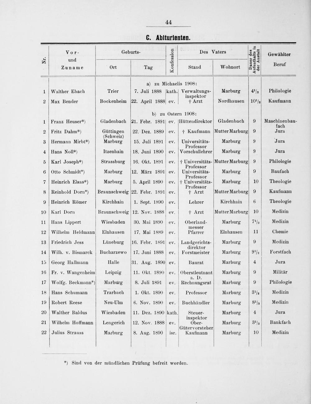 2 Vor- Geburts- 5 Des Vaters 32 3 Gewählter 2 5 283 2 und 8 582 3 5 Beruf Zuname Ort Tag 5 Stand Wohnort 88 A 52 a) zu Michaelis 1908: 1 Walther Ebach Trier 7. Juli 1888 kath.] Verwaltungs- Marburg 4 ½ Philologie inspektor 2 Max Bender Bockenheim 22. April 1888 ev. † Arzt Nordhausen 10 ½ Kaufmann b) zu Ostern 1908: 1 Franz Heuser*) Gladenbach 21. Febr. 1891 ev. Hüttendirektor Gladenbach 9 Maschinenbau- fach 2 FEritz Dahm*) Güttingen 22. Dez. 1889 ev. † Kaufmann Mutter Marburg 9 Jura (Schweiz). 3 Hermann Mirbt*) Marburg 15. Juli 1891 ev. Universitäts- Marburg 9 Jura Professor 4 Hans Noll*) Itzenhain 18. Juni 1890 ev. Vorschullehrer Marburg 9 Jura 5 Karl Joseph*) Strassburg 16. Okt. 1891 ev. † Universitäts- Mutter Marburg 9 Philologie Professor 6 Otto Schmidt*) Marburg 12. März 1891 ev. Universitäts- Marburg 9 Baufach Professor 7 Heinrich Elsas*) Marburg 5. April 1890 ev. † Universitäts- Marburg 10 Theologie Professor 8 Reinhold Dorn*) Braunschweig 22. Febr. 1891 ev. † Arzt Mutter Marburg 9 Kaufmann 9 Heinrich Römer Kirchhain 1. Sept. 1890 ev. Lehrer Kirchhain 6 Theologie 10 Karl Dorn Braunschweig 12. Nov. 1888 ev. † Arzt Mutter Marburg 10 Medizin 11 Hans Lippert Wiesbaden 30. Mai 1890 ev. Oberland- Marburg 7 ½ Medizin messer 12 Wilhelm Heldmann Elnhausen 17. Mai 1889 ev. Pfarrer Elnhausen 11 Chemie 13 Friedrich Jess Lüneburg 16. Febr. 1891 ev. Landgerichts- Marburg 9 Medizin direktor 14 Wilh. v. Bismarck Bucharzewo 17. Juni 1888 ev. Forstmeister Marburg 9 ½ Forstfach 15 Georg Hallmann Halle 31. Aug. 1890 ev. Baurat Marburg 4 Jura 16 Fr. v. Wangenheim Leipzig 11. O0kt. 1890 ev. Oberstleutnant Marburg 9 Militär a. D. 17 Wolfg. Beckmann*) Marburg 8. Juli 1891 ev. Rechnungsrat Marburg 9 Philologie 18 Hans Schumann TPrarbach 1. Okt. 1890 ev. Professor Marburg 3 ½ Medizin 19 Robert Reese Neu-Ulm 6. Nov. 1890 ev. Buchhändler Marburg 8 ½ Medizin 20 Walther Baldus Wiesbaden 11. Dez. 1890 kath. Steuer- Marburg 4 Jura inspektor 21 Wilhelm Hoffmann Lengerich 12. Nov. 1888 ev. Ober- Marburg 3 ½ Bankfach Gütervorsteher 22 Julius Strauss Marburg 8. Aug. 1890 isr. Kaufmann Marburg 10 Medizin