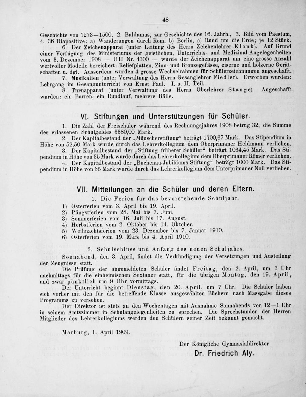 1. Die Ferien für das bevorstehende Schuljahr. 1) Osterferien vom 3. April bis 19. April. 2) Pfingstferien vom 28. Mai bis 7. Juni. 3) Sommerferien vom 16. Juli bis 17. August. 4) Herbstferien vom 2. Oktober bis 14. Oktober. 5) Weihnachtsferien vom 23. Dezember bis 7. Januar 1910. 6) Osterferien vom 19. März bis 4. April 1910.