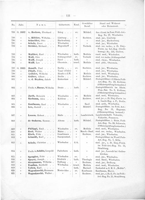 Stand und Wohnort oder Heimatsort. Sec.-Lieut. im Nass. Feld.-Art.- Reg. No. 27, Wiesbaden. stud. jur., Limburg. stud. jur., Hachenburg. stud. jur., Wiesbaden. stud. rer. techn., z. Zt. Einj.- Freiw. im Inf.-Reg.(Groſs- herzog) No. 116, Giefsen. cand. med., Wiesbaden. stud. rer. techn., Schlangenbad stud. chem., Wiesbaden. stud. phil., Oberstein.