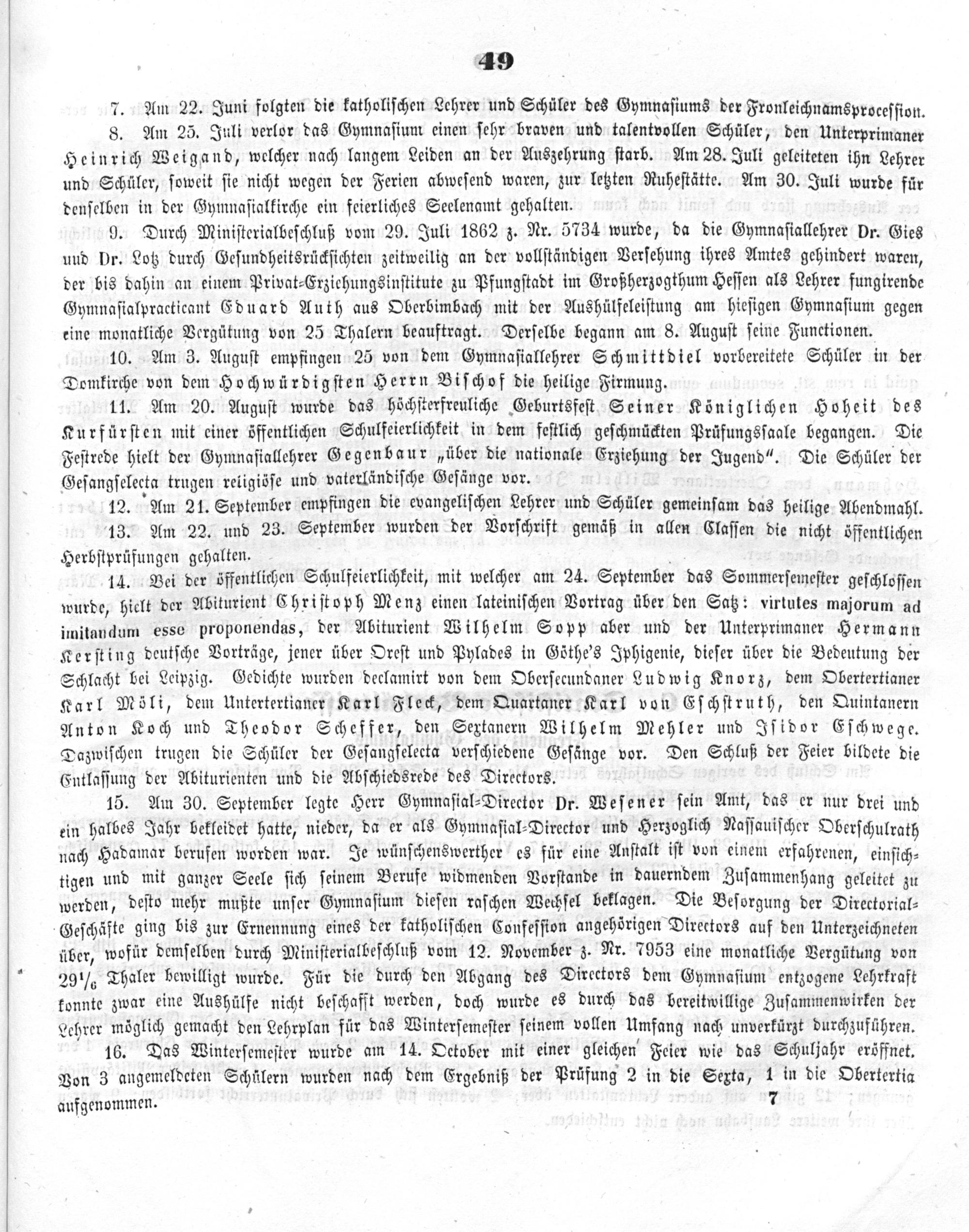9. Durch Miniſterialbeſchluß vom 29. Juli 1862 z. Nr. 5734 wurde, da die Gymnaſiallehrer Dr. Gies uud Dr. Lotz durch Geſundheitsrückſichten zeitweilig an der vollſtändigen Verſehung ihres Amtes gehindert waren, der bis dahin an einem Privat⸗Erziehungsinſtitute zu Pfungſtadt im Großherzogthum Heſſen als Lehrer fungirende Gymnaſialpracticant Eduard Auth aus Oberbimbach mit der Aushülfeleiſtung am hieſigen Gymnaſium gegen eine monatliche Vergütung von 25 Thalern beauftragt. Derſelbe begann am 8. Auguſt ſeine Functionen.