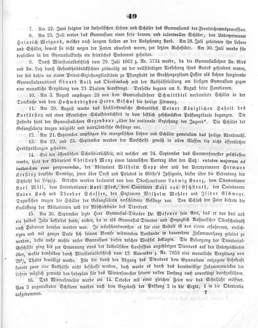 14. Bei der öffentlichen Schulfeierlichkeit, mit welcher am 24. September das Sommerſemeſter geſchloſſen wurde, hielt der Abiturient Chriſtoph Menz einen lateiniſchen Vortrag über den Satz: virtutes majorum ad imitandum esse proponendas, der Abiturient Wilhelm Sopp aber und der Unterprimaner Hermann Kerſting deutſche Vorträge, jener über Oreſt und Pylades in Göthe's Iphigenie, dieſer über die Bedeutung der Schlacht bei Leipzig. Gedichte wurden declamirt von dem Oberſecundaner Ludwig Knorz, dem Obertertianer Karl Möli, dem Untertertianer Karl Fleck, dem Quartaner Karl von Eſchſtruth, den Quintanern Anton Koch und Theodor Scheffer, den Sextanern Wilhelm Mehler und Iſidor Eſchwege. Dazwiſchen trugen die Schüler der Geſangſelecta verſchiedene Geſänge vor. Den Schluß der Feier bildete die Entlaſſung der Abiturienten und die Abſchiedsrede des Directors.