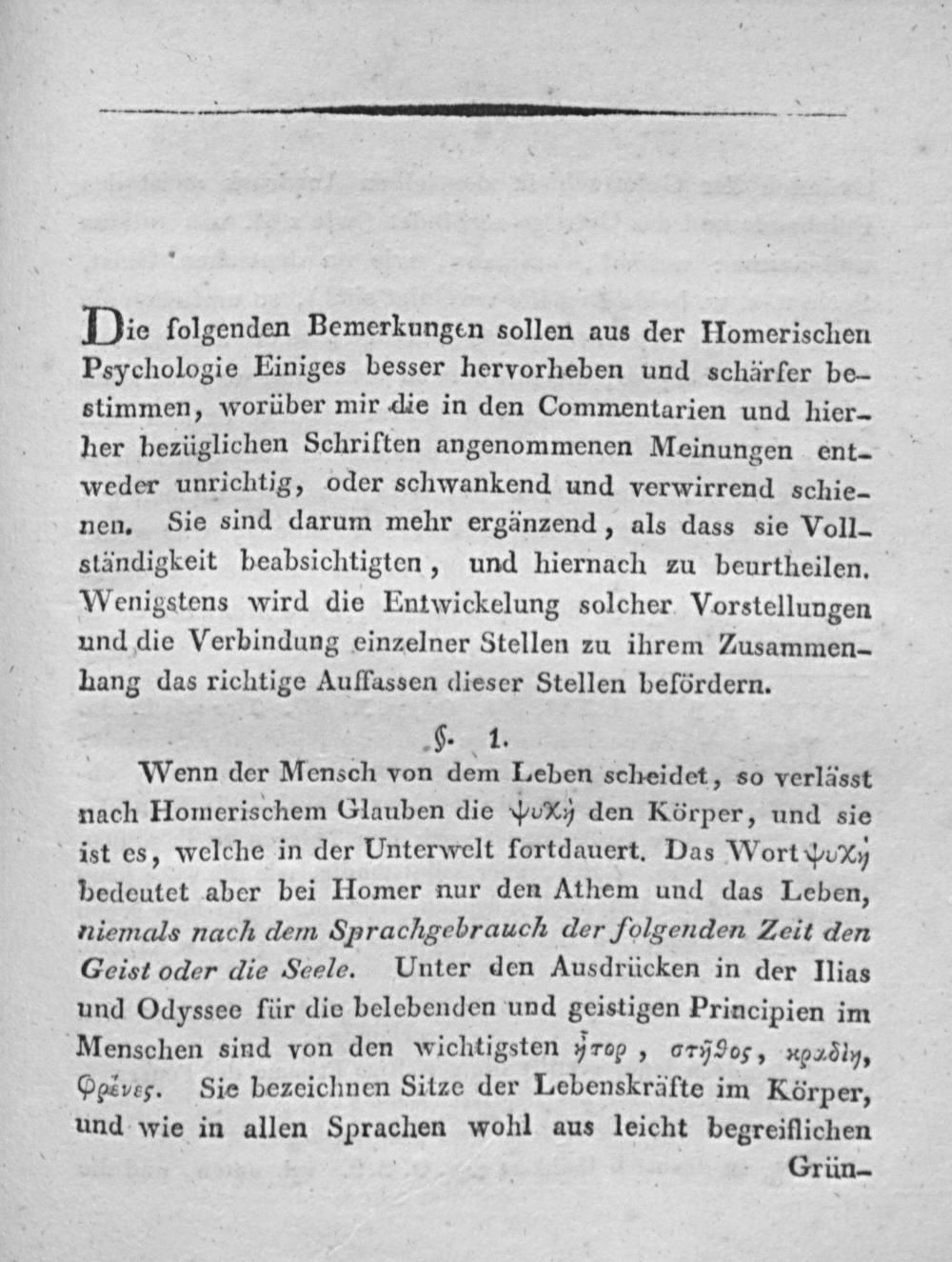 Die ſolgenden Bemerkungen sollen aus der IHIomerischen Psychologie Einiges besser hervorheben und schärfer be- stimmen, worüber mir die in den Commentarien und hier- her bezüglichen Schriften angenommenen Meinungen ent- weder unrichtig, oder schwankend und verwirrend schie- nen. Sie sind darum mehr ergänzend, als dass sie Voll- ständigkeit beabsichtigten, und hiernach zu beurtheilen. Wenigstens wird die Entwickelung solcher Vorstellungen und die Verbindung einzelner Stellen zu ihrem Zusammen- hang das richtige Auffassen dieser Stellen befördern.