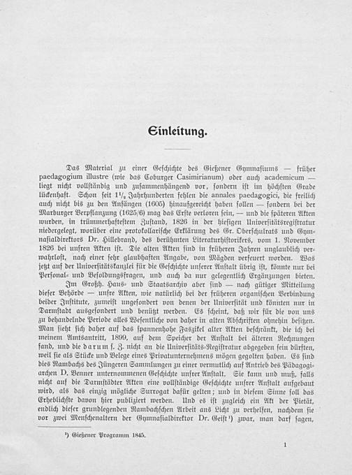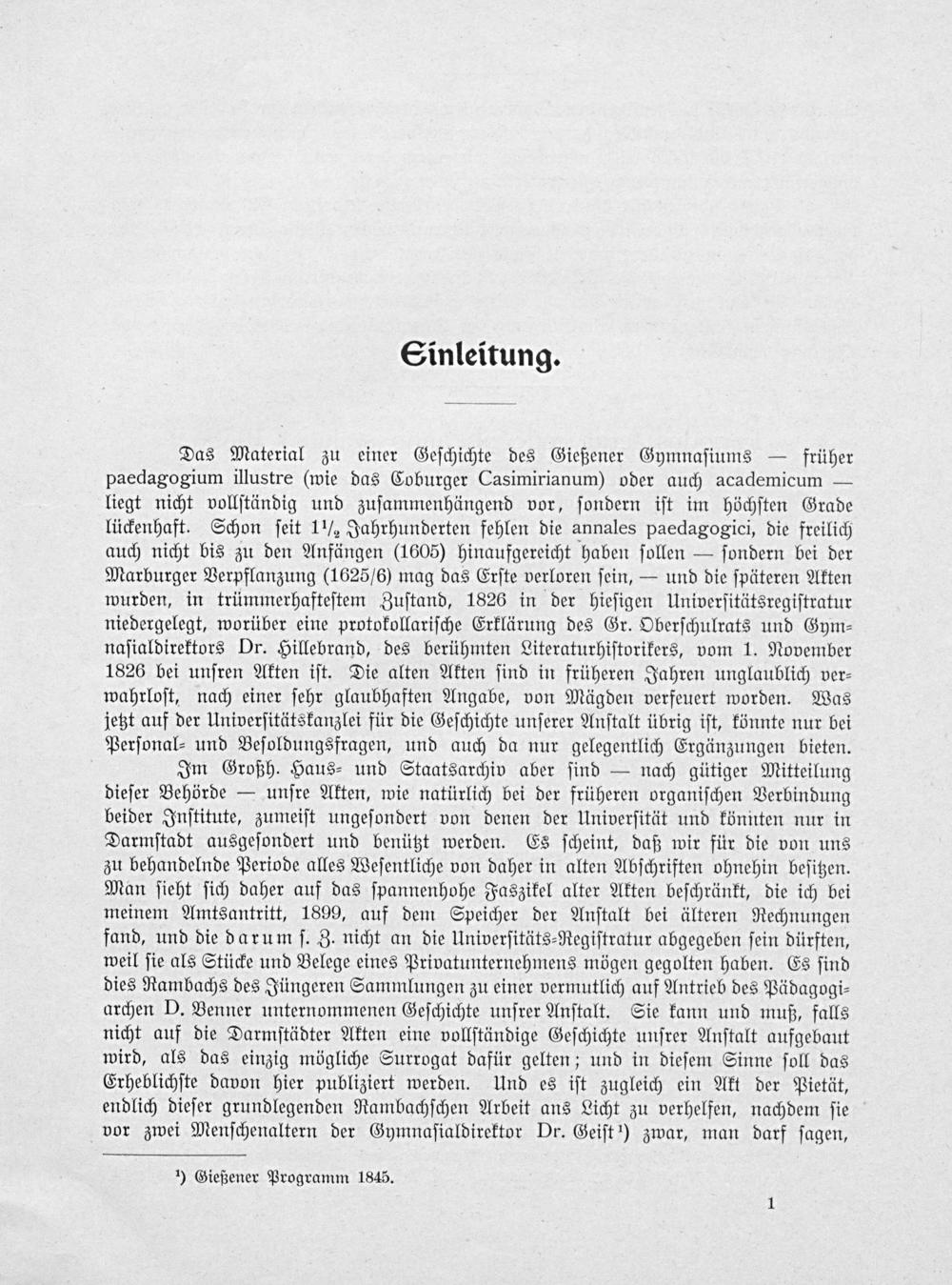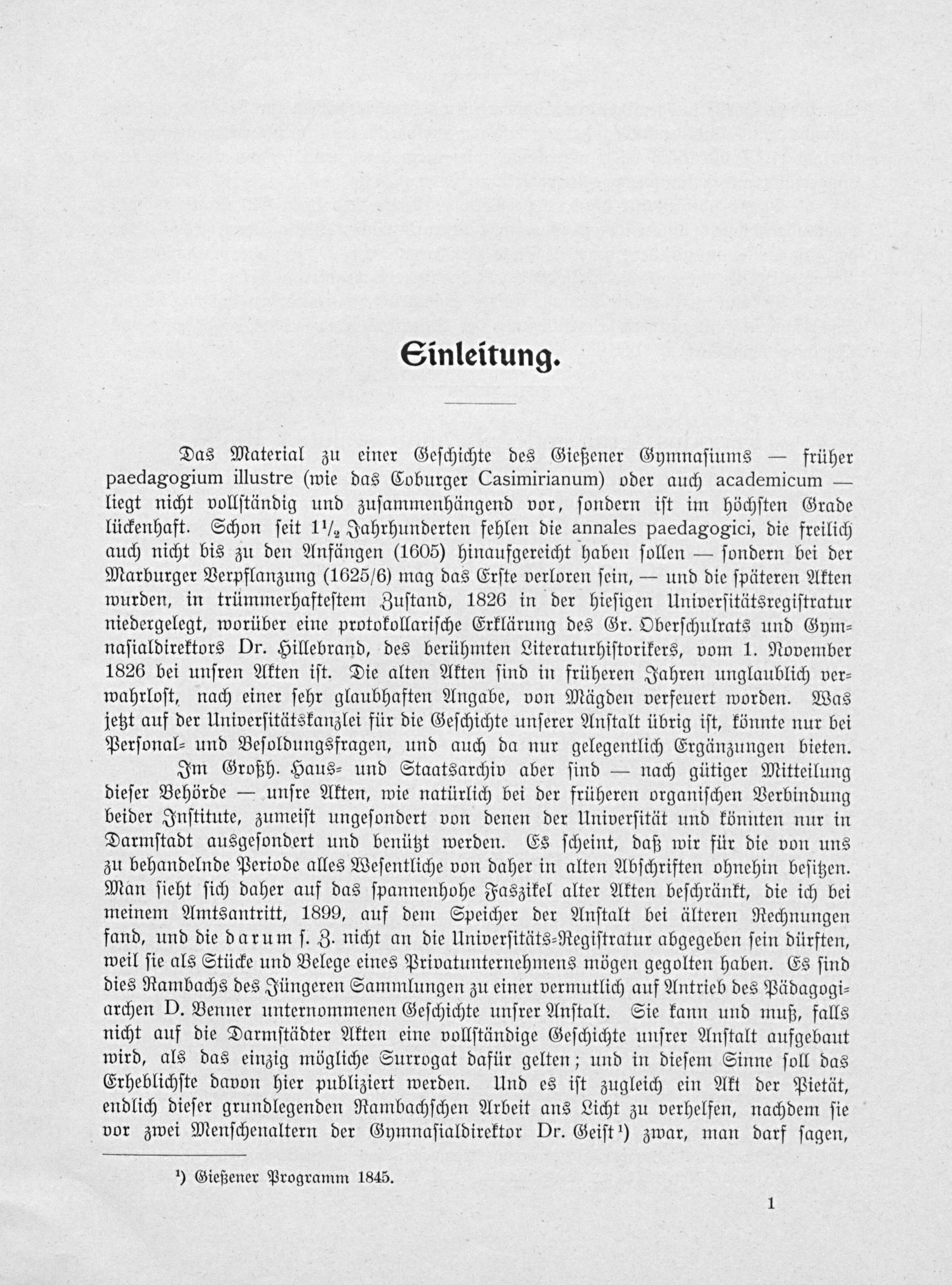Das Material zu einer Geſchichte des Gießener Gymnaſiums— früher paedagogium illustre(wie das Coburger Casimirianum) oder auch academicum— liegt nicht vollſtändig und zuſammenhängend vor, ſondern iſt im höchſten Grade lückenhaft. Schon ſeit 1 ½ Jahrhunderten fehlen die annales paedagogici, die freilich auch nicht bis zu den Anfängen(1605) hinaufgereicht haben ſollen— ſondern bei der Marburger Verpflanzung(1625/6) mag das Erſte verloren ſein,— und die ſpäteren Akten wurden, in trümmerhafteſtem Zuſtand, 1826 in der hieſigen Univerſitätsregiſtratur niedergelegt, worüber eine protokollariſche Erklärung des Gr. Oberſchulrats und Gym⸗ naſialdirektors Dr. Hillebrand, des berühmten Literaturhiſtorikers, vom 1. November 1826 bei unſren Akten iſt. Die alten Akten ſind in früheren Jahren unglaublich ver⸗ wahrloſt, nach einer ſehr glaubhaften Angabe, von Mägden verfeuert worden. Was jetzt auf der Univerſitätskanzlei für die Geſchichte unſerer Anſtalt übrig iſt, könnte nur bei Perſonal⸗ und Beſoldungsfragen, und auch da nur gelegentlich Ergänzungen bieten.