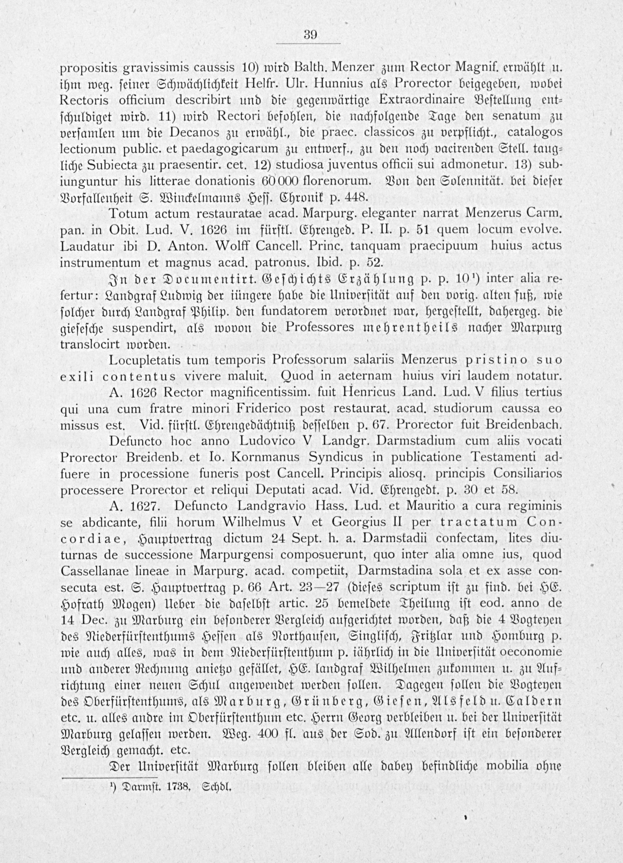 propositis gravissimis caussis 10) wird Balth. Menzer zum Rector Magnif. erwählt u. ihm weg. ſeiner Schwächlichkeit Helfr. Ulr. Hunnius als Prorector beigegeben, wobei Rectoris officium describirt und die gegenwärtige Extraordinaire Beſtellung ent⸗ ſchuldiget wird. 11) wird Rectori befohlen, die nachfolgende Tage den senatum zu verſamlen um die Decanos zu erwähl., die praec. classicos zu verpflicht., catalogos lectionum public. et paedagogicarum zu entwerf., zu den noch vacirenden Stell. taug⸗ liche Subiecta zu praesentir. cet. 12) studiosa juventus officii sui admonetur. 13) sub- iunguntur his litterae donationis 60 000 florenorum. Von den Solennität. bei dieſer Vorfallenheit S. Winckelmanns Heſſ. Chronik p. 448.