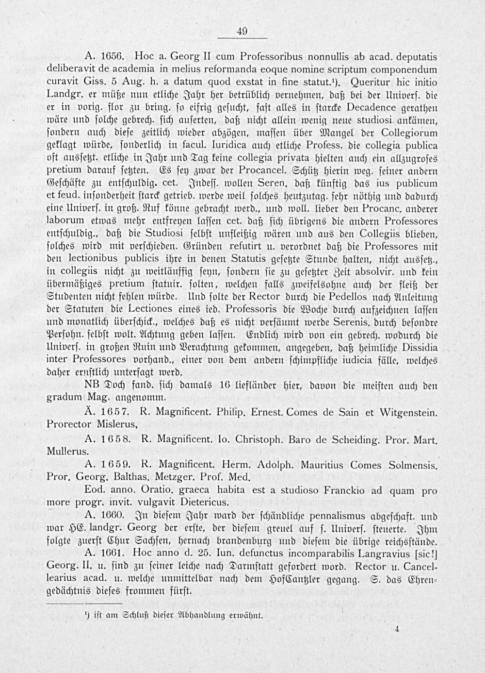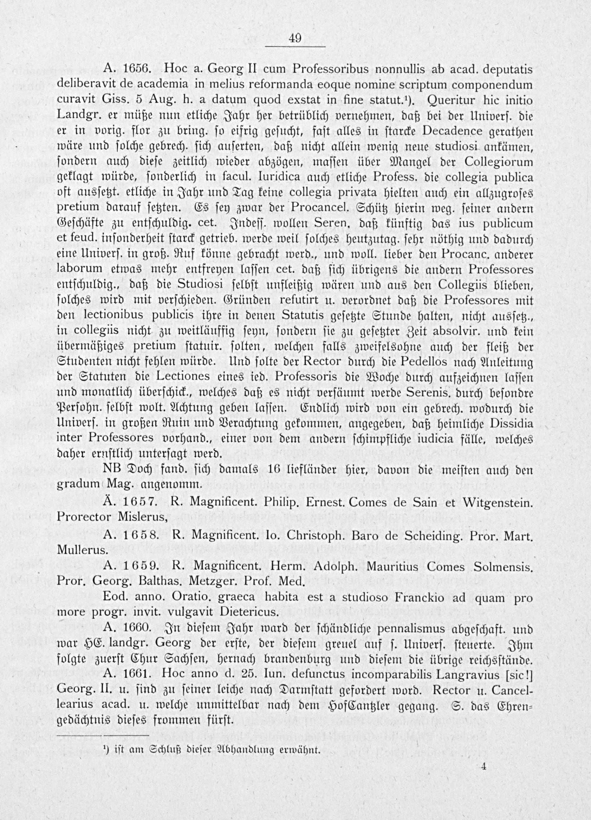 A. 1656. Hoc a. Georg II cum Professoribus nonnullis ab acad. deputatis deliberavit de academia in melius reformanda eoque nomine scriptum componendum curavit Giss. 5 Aug. h. a datum quod exstat in fine statut. ¹1). Queritur hic initio Landgr. er müße nun etliche Jahr her betrüblich vernehmen, daß bei der Univerſ. die er in vorig. flor zu bring. ſo eifrig geſucht, faſt alles in ſtarcke Decadence gerathen wäre und ſolche gebrech. ſich auſerten, daß nicht allein wenig neue studiosi ankämen, ſondern auch dieſe zeitlich wieder abzögen, maſſen über Mangel der Collegiorum geklagt würde, ſonderlich in facul. luridica auch etliche Profess. die collegia publica oft ausſetzt. etliche in Jahr und Tag keine collegia privata hielten auch ein allzugroſes pretium darauf ſetzten. Es ſey zwar der Procancel. Schütz hierin weg. ſeiner andern Geſchäfte zu entſchuldig. cet. Indeſſ. wollen Seren, daß künftig das ius publicum et feud. inſonderheit ſtarck getrieb. werde weil ſolches heutzutag. ſehr nöthig und dadurch eine Univerſ. in groß. Ruf könne gebracht werd., und woll. lieber den Procanc. anderer laborum etwas mehr entfreyen laſſen cet. daß ſich übrigens die andern Professores entſchuldig., daß die Studiosi ſelbſt unfleißig wären und aus den Collegis blieben, ſolches wird mit verſchieden. Gründen refutirt u. verordnet daß die Professores mit den lectionibus publicis ihre in denen Statutis geſetzte Stunde halten, nicht ausſetz., in collegiis nicht zu weitläuffig ſeyn, ſondern ſie zu geſetzter Zeit absolvir. und kein übermäßiges pretium ſtatuir. ſolten, welchen falls zweifelsohne auch der fleiß der Studenten nicht fehlen würde. Und ſolte der Rector durch die Pedellos nach Anleitung der Statuten die Lectiones eines ied. Professoris die Woche durch aufzeichnen laſſen und monatlich überſchick., welches daß es nicht verſäumt werde Serenis. durch beſondre Perſohn. ſelbſt wolt. Achtung geben laſſen. Endlich wird von ein gebrech. wodurch die Univerſ. in großen Ruin und Verachtung gekommen, angegeben, daß heimliche Dissidia inter Professores vorhand., einer von dem andern ſchimpfliche iudicia fälle, welches daher ernſtlich unterſagt werd.