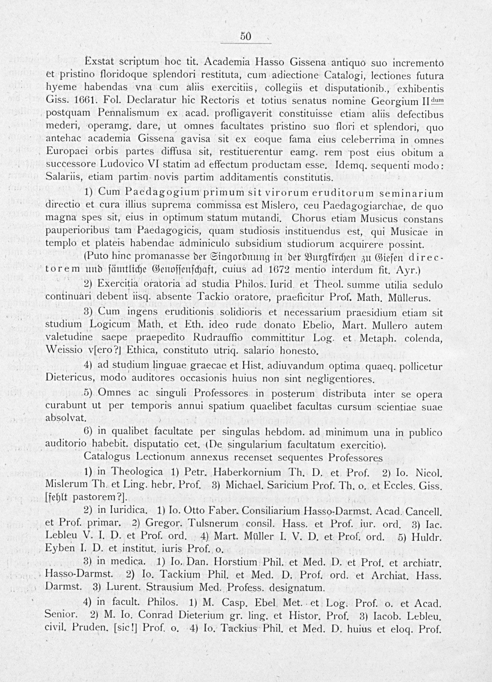 et Prof. primar. 2) Gregor. Tulsnerum consil. Hass. et Prof. iur. ord. 3) lac. Lebleu V. I. D. et Prof. ord. 4) Mart. Müller I. V. D. et Prof. ord. 5) Huldr. Eyben I. D. et institut. iuris Prof. o. . 3) in medica. 1) Io. Dan. Horstium Phil. et Med. D. et Prof. et archiatr. Hasso-Darmst. 2) Io. Tackium Phil. et Med. D. Prof. ord. et Archiat. Hass. Darmst. 3) Lurent. Strausium Med. Profess. designatum. 4) in facult. Philos. 1) M. Casp. Ebel. Met. et Log. Prof. o. et Acad. Senior. 2) M. Io. Conrad Dieterium gr. ling. et Histor. Prof. 3) lacob. Lebleu. civil. Pruden.[sic!] Prof. o. 4) lo. Tackius Phil. et Med. D. huius et eloq. Prof.