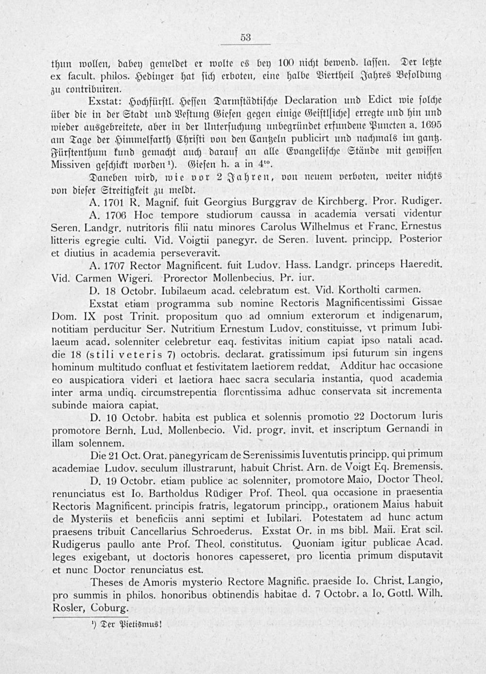 Exstat etiam programma sub nomine Rectoris Magnificentissimi Gissae Dom. IX post Trinit. propositum quo ad omnium exterorum et indigenarum, notitiam perducitur Ser. Nutritium Ernestum Ludov. constituisse, vt primum lubi- laeum acad. solenniter celebretur eaq. festivitas initium capiat ipso natali acad. die 18(stili veteris 7) octobris. declarat. gratissimum ipsi futurum sin ingens hominum multitudo confluat et festivitatem laetiorem reddat. Additur hac occasione eo auspicatiora videri et laetiora haec sacra secularia instantia, quod academia inter arma undiq. circumstrepentia florentissima adhuc conservata sit incrementa subinde maiora capiat.