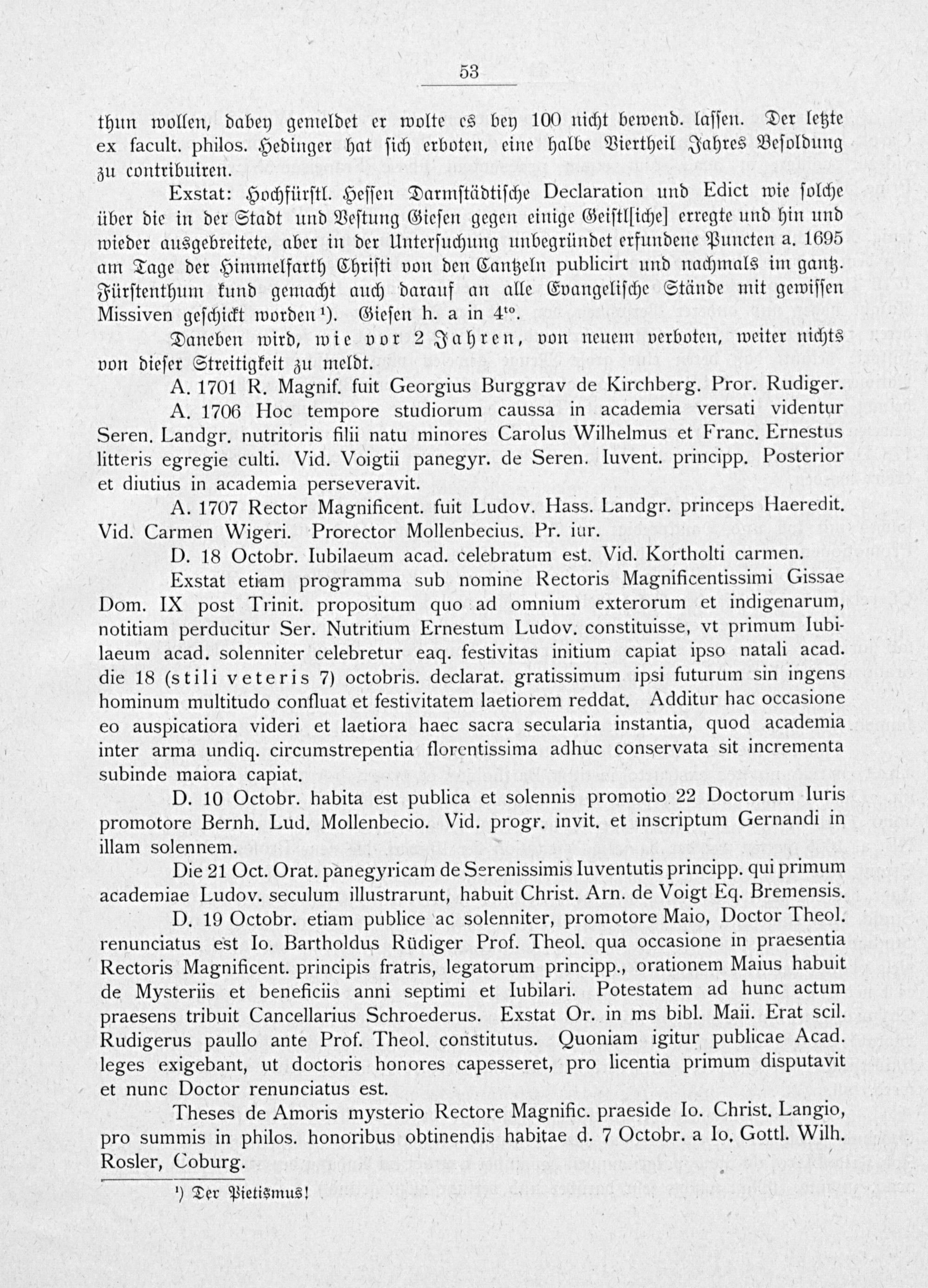 Exstat: Hochfürſtl. Heſſen Darmſtädtiſche Declaration und Edict wie ſolche über die in der Stadt und Veſtung Gieſen gegen einige Geiſtlliche] erregte und hin und wieder ausgebreitete, aber in der Unterſuchung unbegründet erfundene Puncten a. 1695 am Tage der Himmelfarth Chriſti von den Cantzeln publicirt und nachmals im gantz. Fürſtenthum kund gemacht auch darauf an alle Evangeliſche Stände mit gewiſſen Missiven geſchickt worden ¹). Gieſen h. a in 4.