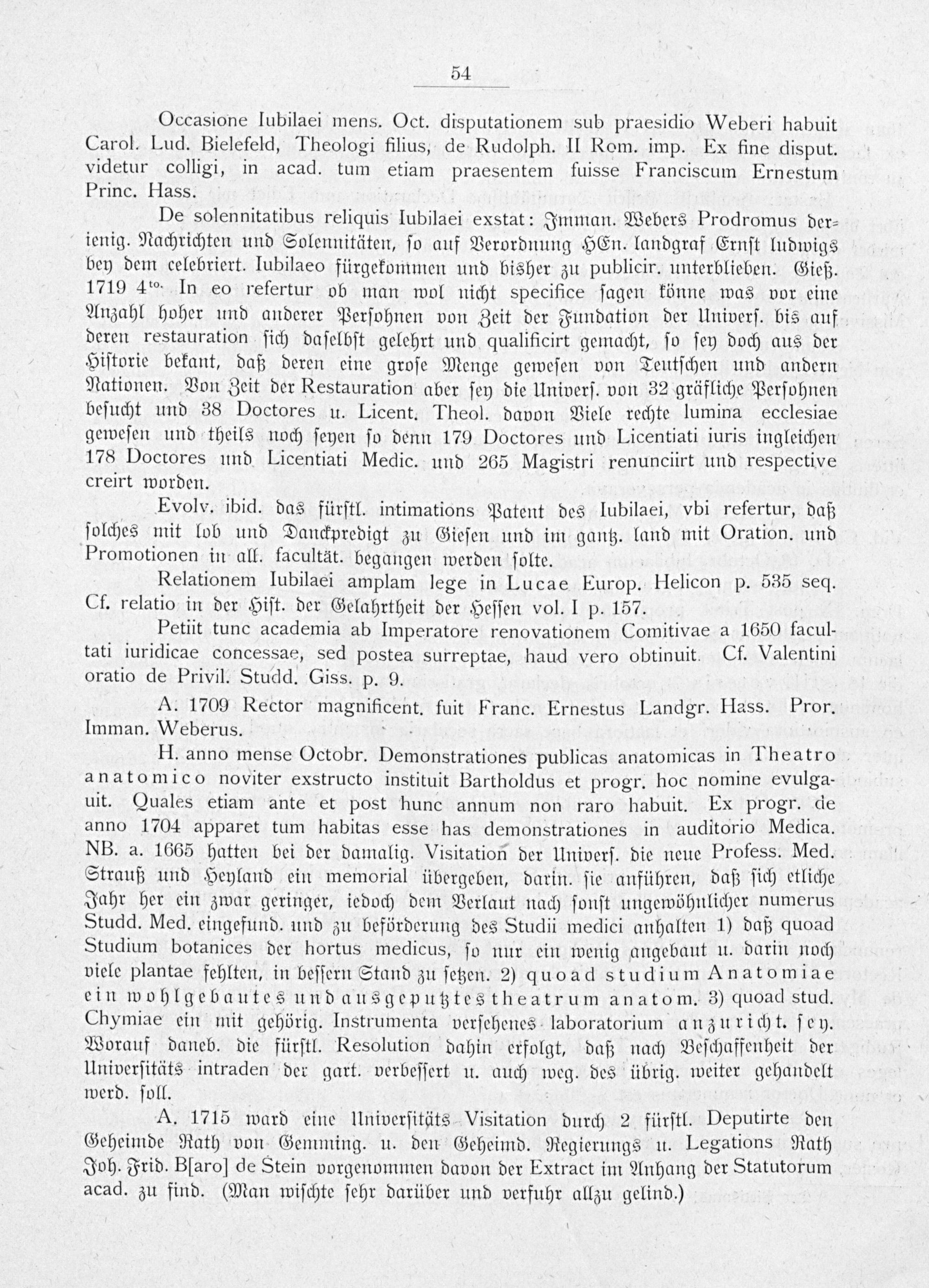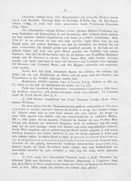 Carol. Lud. Bielefeld, Theologi filius, de Rudolph. II Rom. imp. Ex fine disput. videtur colligi, in acad. tum etiam praesentem fuisse Franciscum Ernestum Princ. Hass. De solennitatibus reliquis Iubilaei exstat: Imman. Webers Prodromus der- ienig. Nachrichten und Solennitäten, ſo auf Verordnung HEn. landgraf Ernſt ludwigs bey dem celebriert. lubilaeo fürgekommen und bisher zu publicir. unterblieben. Gieß. 1719 4 ο. In eo refertur ob man wol nicht specifice ſagen könne was vor eine Anzahl hoher und anderer Perſohnen von Zeit der Fundation der Univerſ. bis auf deren restauration ſich daſelbſt gelehrt und qualificirt gemacht, ſo ſey doch aus der Hiſtorie bekant, daß deren eine groſe Menge geweſen von Teutſchen und andern Nationen. Von Zeit der Restauration aber ſey die Univerſ. von 32 gräfliche Perſohnen beſucht und 38 Doctores u. Licent. Theol. davon Viele rechte lumina ecclesiae geweſen und theils noch ſeyen ſo denn 179 Doctores und Licentiati iuris ingleichen 178 Doctores und Licentiati Medic. und 265 Magistri renuncürt und respective creirt worden.