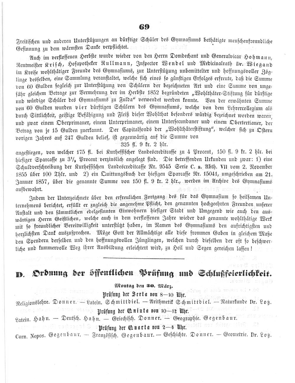 Auch im verfloſſenen Herbſte wurde wieder von den Herrn Domdechant und Generalvicar Hohmann Rentmeiſter Kriſch, Hofapotheker Rullmann, Inſpector Wendel und Medieinalrath Dr. Wiegand im Kreiſe wohlthätiger Freunde des Gymnaſiums, zur Unterſtützung unbemittelter und hoffnungsvoller Zög⸗ linge desſelben, eine Sammlung veranſtaltet, welche ſich eines ſo günſtigen Erfolges erfreute, daß die Summe von 60 Gulden ſogleich zur Unterſtützung von Schülern der bezeichneten Art und eine Summe von unge— fähr gleichem Betrage zur Vermehrung der im Herbſte 1852 begründeten„Wohlthäter⸗Stiftung für dürftige und würdige Schüler des Gymnaſiums zu Fulda“ verwendet werden konnte. Von der erwähnten Summe von 60 Gulden wurden vier dürftigen Schülern des Gymnaſiums, welche von dem Lehrercollegium als durch Sittlichkeit, geiſtige Befähigung und Fleiß dieſer Wohlthat beſonders würdig bezeichnet worden waren und zwar einem Oberprimaner, einem Unterprimaner, einem Unterſecundaner und einem Obertertianer, der Betrag von je 15 Gulden zuerkannt. Der Capitalfonds der„Wohlthäterſtiftung“, welcher ſich zu Oſtern vorigen Jahres auf 247 Gulden belief, iſt gegenwärtig auf die Summe von