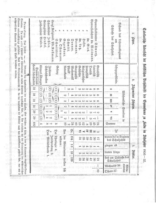 7 1. Kehrer. 2. Allgemeiner Lehrplan. 3. Schüler. Abitu⸗ Wöchentliche Stunden in 5 2 rienten Beſtand des Lehrercollegiums 5S. e am Lehrgegenſtände. In S 2 552 22. ne 1 Z 2——,8 Schluſſe des Schuljahrs. 1I IV v VI 5 9 2[s53* S 5 258= 2 NE 3 Griechiſch 6 6 6 4 2—[24 1 17 1 5 21— 10 Dyud dit Sunab. un. Lateiniſch 8 8S817 17 7 45 n 30 11 30 ymnaſiallehrer Dr. Weismann. Deutſch 4 3 3 3 3 3 19 m 42 3 2 41 „ Dr. Gies. Franzöſiſch 2 2 2 1 2—— 8 W 39 41 3 38 „ Hahn. Religionslehre 2 2 ⁰ 2 ⁰ 21/ 2 2 12 v 35 3 2 34 „ Dr. Lotz. Geſchichte 31 52 2 B2 2 2 13 VI 31 1. 5 35 „ Bormann. Geographie- 2 2 2 2 2 10 „ Donner. Mathematik 4 4 4° 4 4 4[24 Se.[191 13 18 190 5 Schmitt. Phyſik 2————— 2 .„ Gegenbaur. Naturkunde— 2 2 21 2 2 1¹0 Von den Abiturienten wollen ſich l„ Dr. Oſtermann. 1 1 widmen: Cnal Reun 22 Baattuhn. Geſan(D(5(1(0(15(1) 4⁴ Der Theologie 6. Eyngl. Religionsl. Pfr. Rollmann..—— urisprudenz 3. Schreiblehrer Jeßler. Zeichnen(2) G) Ge 1. 4 6 den Vindhrdene 1. Geſanglehrer Henkel. Schönſchreben—8————— Zeichenlehrer Binder. Körperl.Ubungen(2)(2)(2)(2)1(2)(2) 4 Summe der wöͤ⸗ ſhentl. Lehrſtunden 31 31 31 31 29 29 182 —— 17———— Bemerkung. Das Zeichen—— bedeutet die Combination der drei Claſſen, über welchen es ſteht, in den in Klammern eingeſchloſſenen Stunden. Da nicht alle Schüler zur Theilnahme an dieſen Stunden verpflichtet ſind, ſo find dieſelben bei der Summirung der wöchentlichen Stunden unberückſichtigt geblieben. Auch der Religionsunterricht iſt, da bei demſelben die Schüler nach den Confeſſionen getheilt ſind, nur mit 2. wöchentlichen Stunden für jede Claſſe berechnet worden.