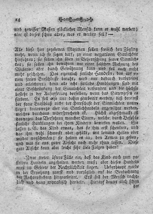 war treten oͤfters Faͤlle ein, daß das Kind auch zum po⸗ ſitiven Handeln angehalten werden muß; aber dieſes Handeln muß im Gebiete der Rechtlichkeit liegen. Ueberhaupt werde in der Erziehung zuerſt und vorzuͤglich auf die Beobachtung der Rechtspflichten hingearbeitet. Erſt ſoll der Menſch recht⸗ lich und dann moraliſch handeln. Hierzuf deutet anch ſchan 4——— 4 3. de