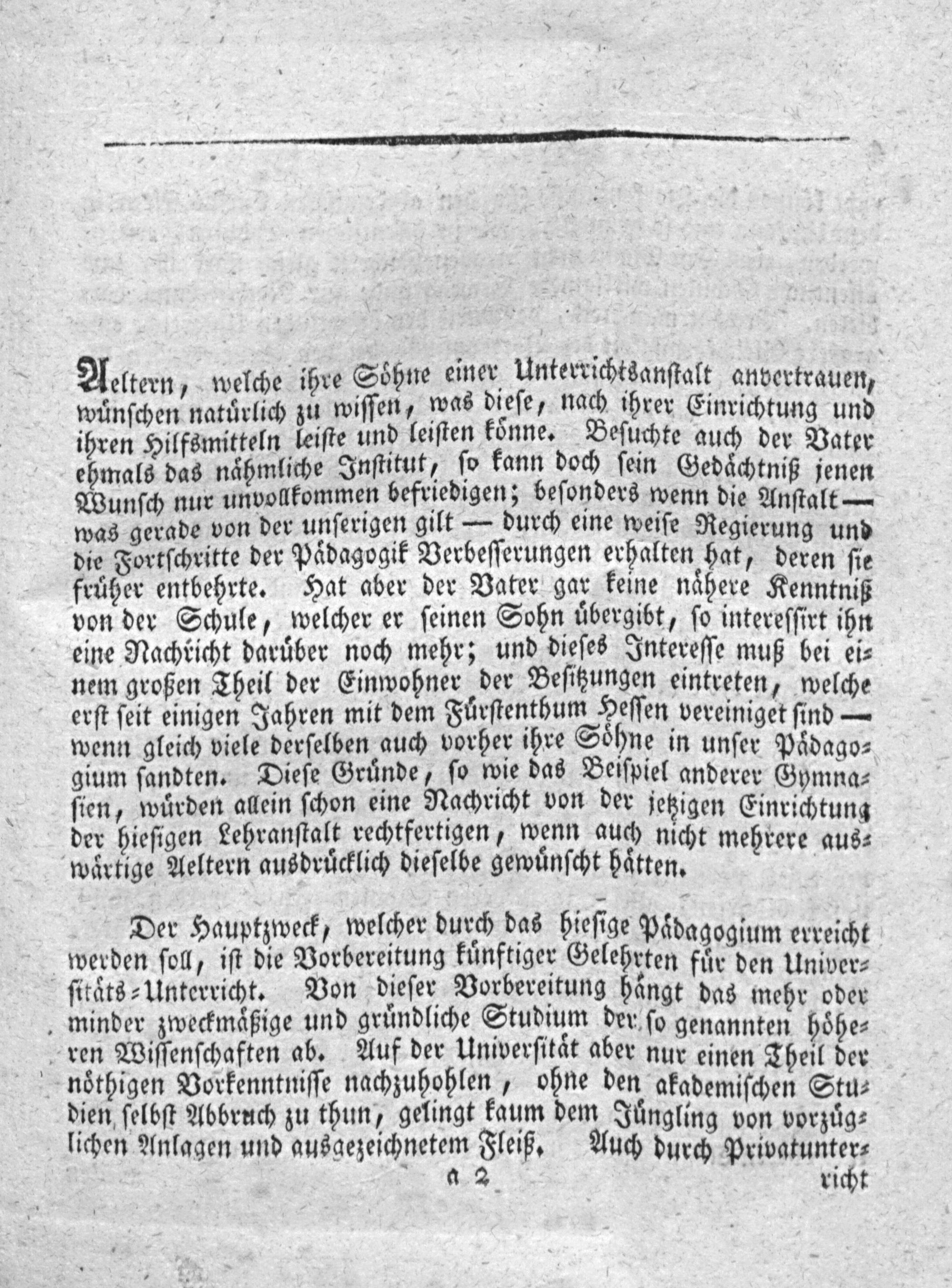 Aeltern, welche ihre Soͤhne einer Unterrichtsanſtalt anvertrauen, Seeenanect 1 wiſſen, was dieſe, nach ihrer Einrichtung und ihren Hilfsmitteln leiſte und leiſten koͤnne. Beſuchte auch der Vater ehmals das naͤhmliche Inſtitut, ſo kann doch ſein Gedaͤchtniß jenen Wunſch nur unvollkommen befriedigen; beſonders wenn die Anſtalt— was gerade von der unſerigen gilt— durch eine weiſe Regierung und die Fortſchritte der Paͤdagogik Verbeſſerungen erhalten hat deren ſie fruͤher entbehrte. Hat aber der Vater gar keine naͤhere Kenntniß von der Schule, welcher er ſeinen Sohn uͤbergibt, ſo intereſſirt ihn eine Nachkicht daruͤber noch mehr; und dieſes Intereſſe muß bei ei⸗ nem großen Theil der Einwohner der Beſitzungen eintreten, welche erſt ſeit einigen Jahren mit dem Fuͤrſtenthum Heſſen vereiniget ſind— wenn gleich diele derſelben auch vorher ihre Soͤhne in unſer Paͤdago⸗ gium ſandten. Dieſe Gruͤnde, ſo wie das Beiſpiel anderer Gymna⸗ ſien, wuͤrden allein ſchon eine Nachricht von der jetzigen Einrichtung der hieſigen Lehranſtalt rechtfertigen, wenn auch nicht mehrere aus⸗ waͤrtige Aeltern ausdruͤcklich dieſelbe gewuͤnſcht haͤtten.—