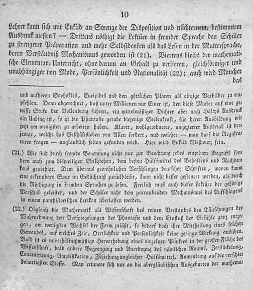 10 Lehrer kann ſich mit Euklid an Strenge der Dispoſition und nüchternem, beſtimmtem Ausdruck meſſen?— Drittens nöthigt die Lektüre in fremder Sprache den Schüler zu ſtrengerer Präparation und mehr Selbſtdenken als das Leſen in der Mutterſprache, deren Verſtändniß Mechanismus geworden iſt(21). Vierkens bleibt der mathemati⸗ ſche Elementar⸗Unterricht, ohne darum an Gehalt zu verlieren, gleichförmiger und unabhängiger von Mode, Perſönlichkeit und Nationalität(22); auch wird Munher da