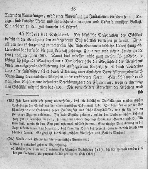 4.) Arbeit des Schülers. Die häusliche Präparation des Schülers beſteht in der Bemühung den aufgegebenen Sab wörtlich verſtehen zu lernen. Zeug⸗ niß von dem Gelingen legt entweder eine ſchriftliche oder eine mündliche Ueberſetzung ab. Ueberdies hat derſelbe die zum Lehrſatz gehörige Figur rein und richtig(nicht gerade fein) nachzuzeichnen(39). Damit dies indeſſen nicht ganz mechaniſch geſchehe, ſo ſchlage ich folgende Maaßregel vor: Der Lehrer gebe die Möglichkeit des Verſtehens